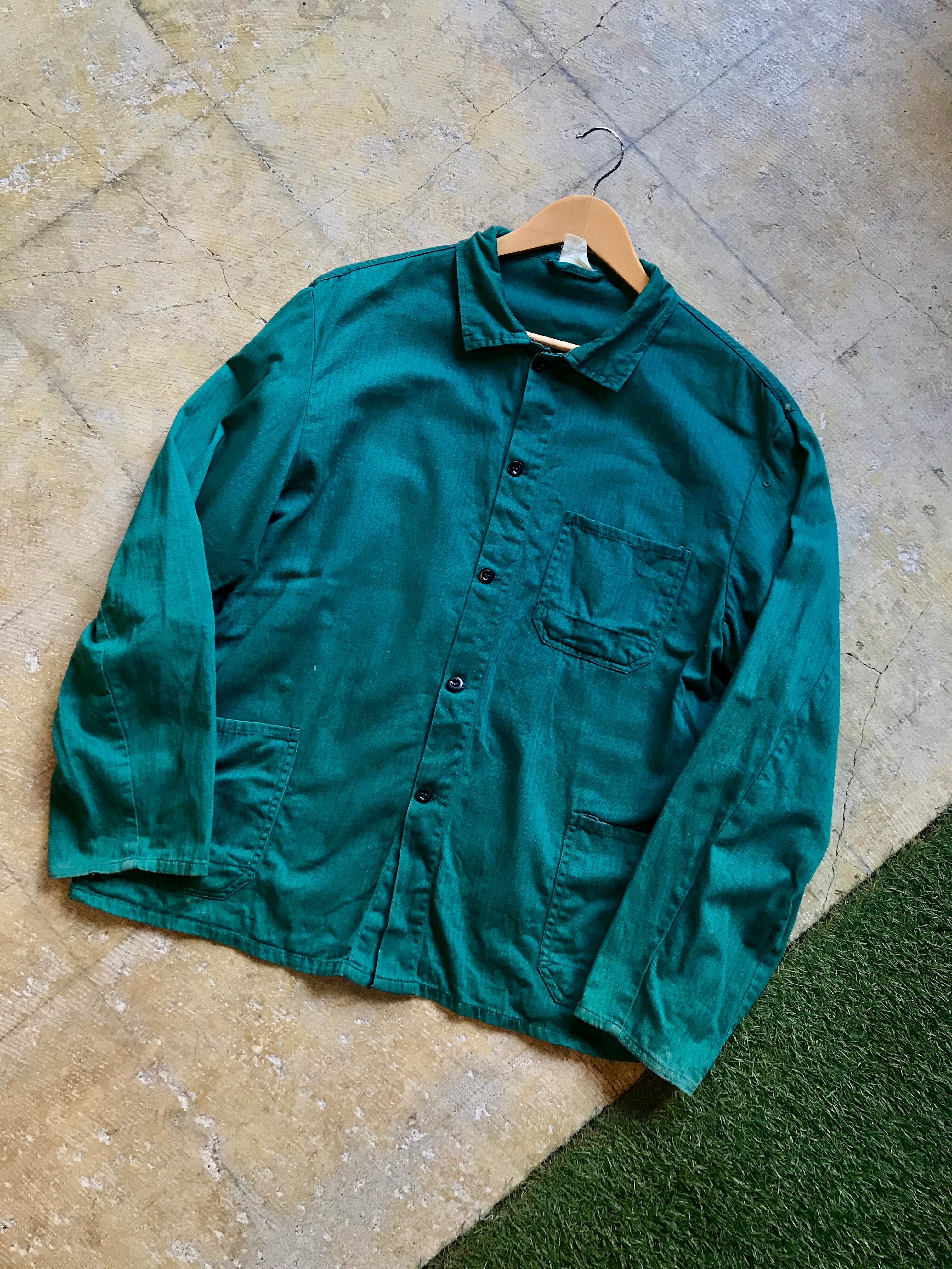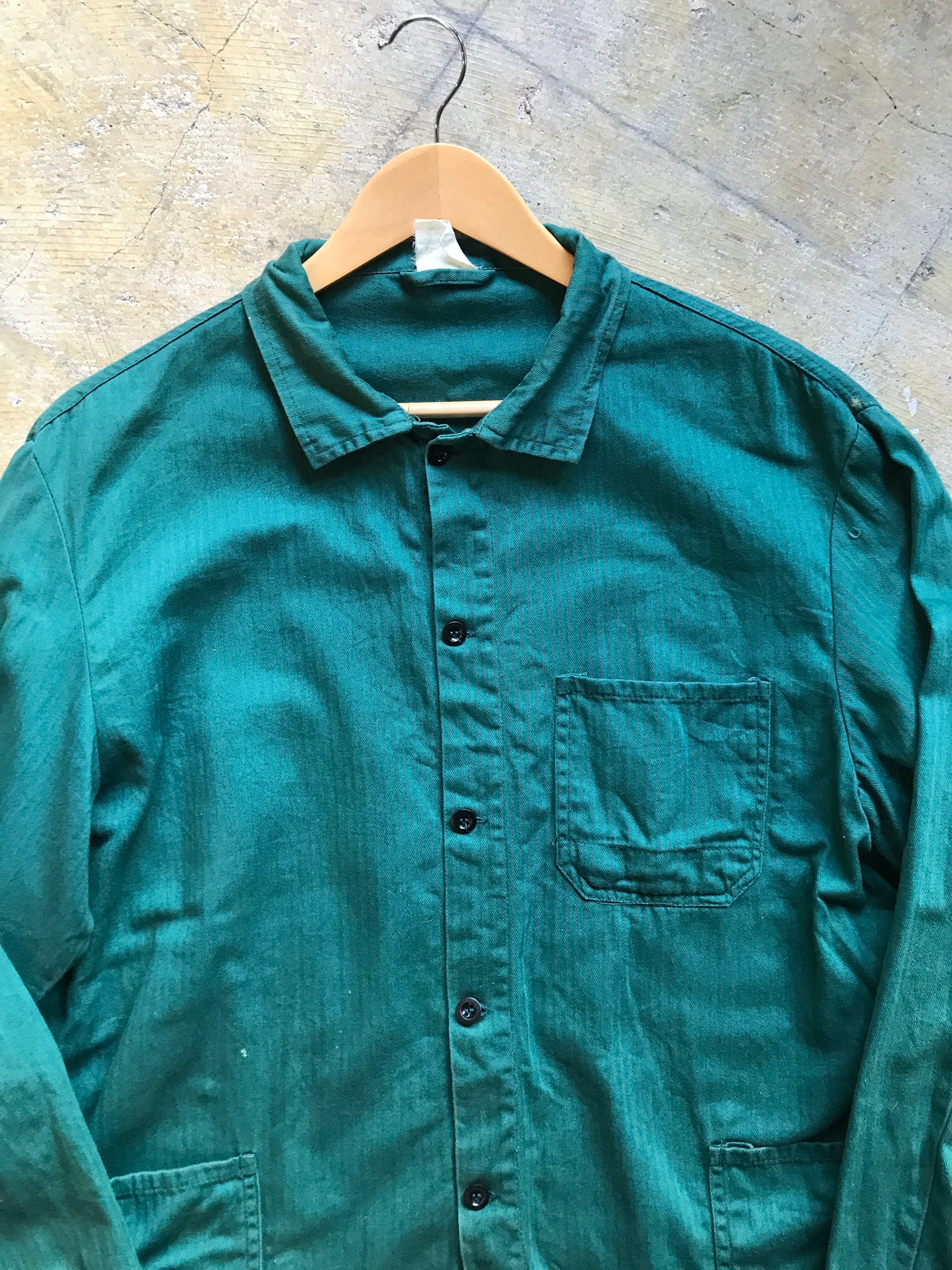 ヨーロッパのドイツのワークジャケットです。発色の良いグリーンはワーク物ですがモダンに見えますよ。ワーク特有の汚れはあり雰囲気も抜群です。シャツ生地ですのでこれからの季節に是非。