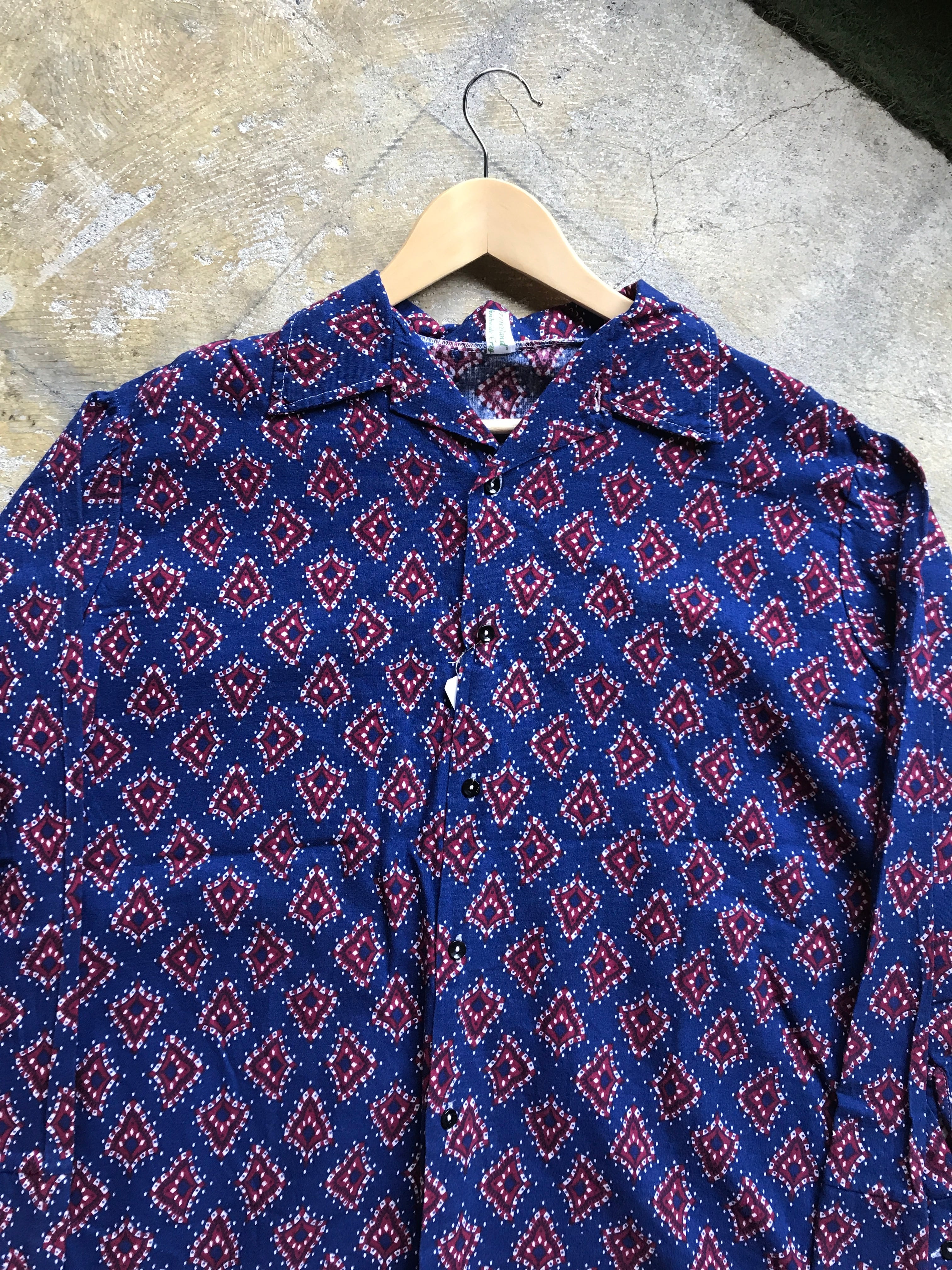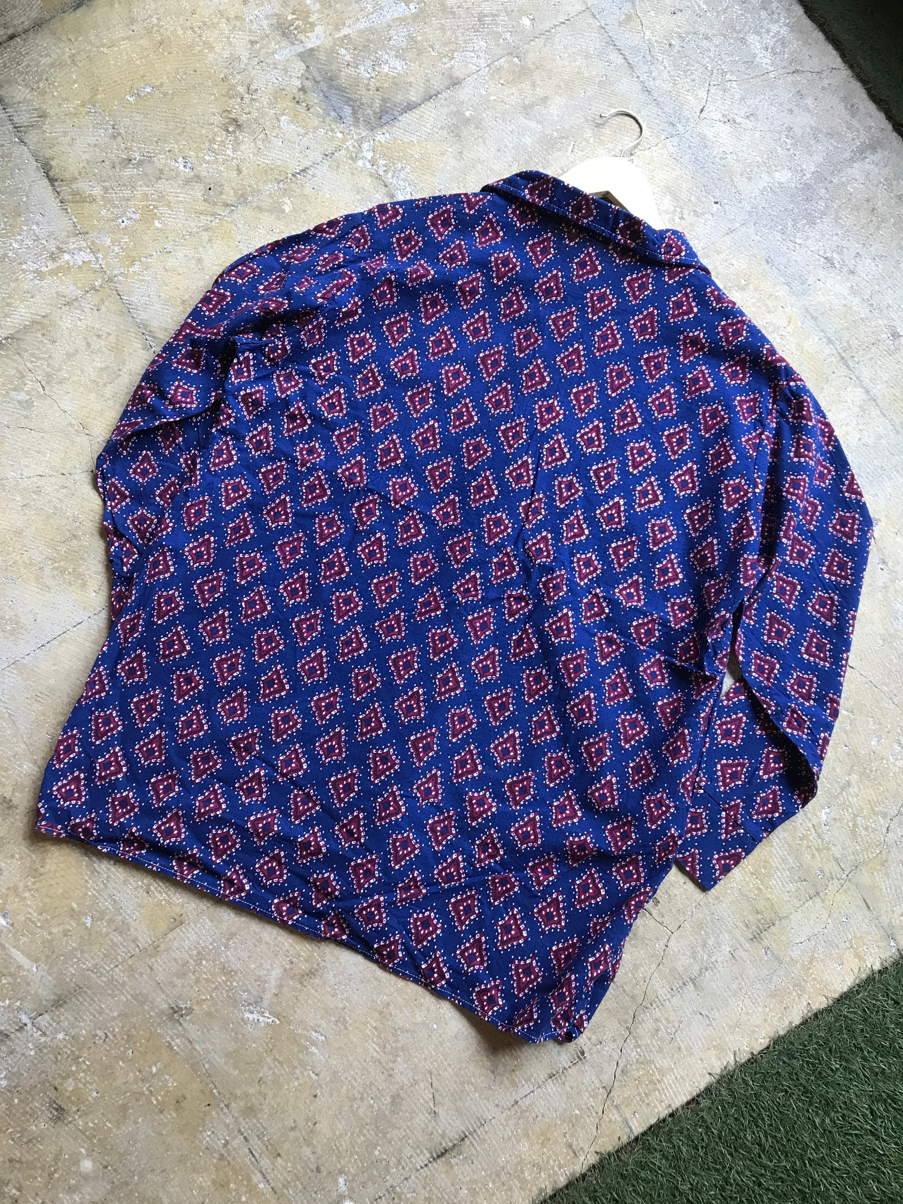 ヨーロッパのデザインシャツです。独特な柄にボックスのシルエットがモダンで素敵ですね。スラックスで綺麗に着てもいいですし、デニムでラフに着てもいいですね。是非。