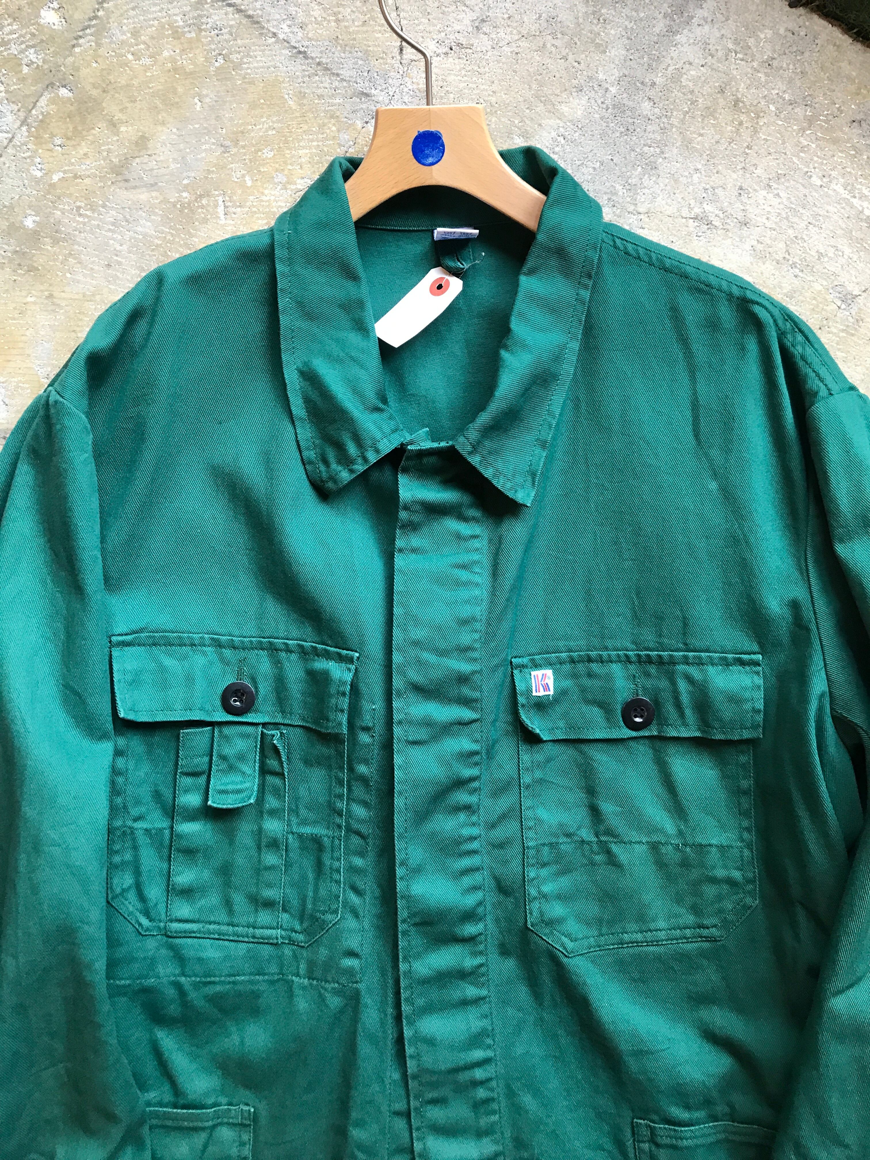 ドイツのビックサイズのワークジャケットです。レアカラーの発色のいいグリーンの色にワークのディティールが素敵ですよ。生地もがっしりとしたコットンになりますのでガシガシお使いいただけます。ブラックデニムなどとぜひ。