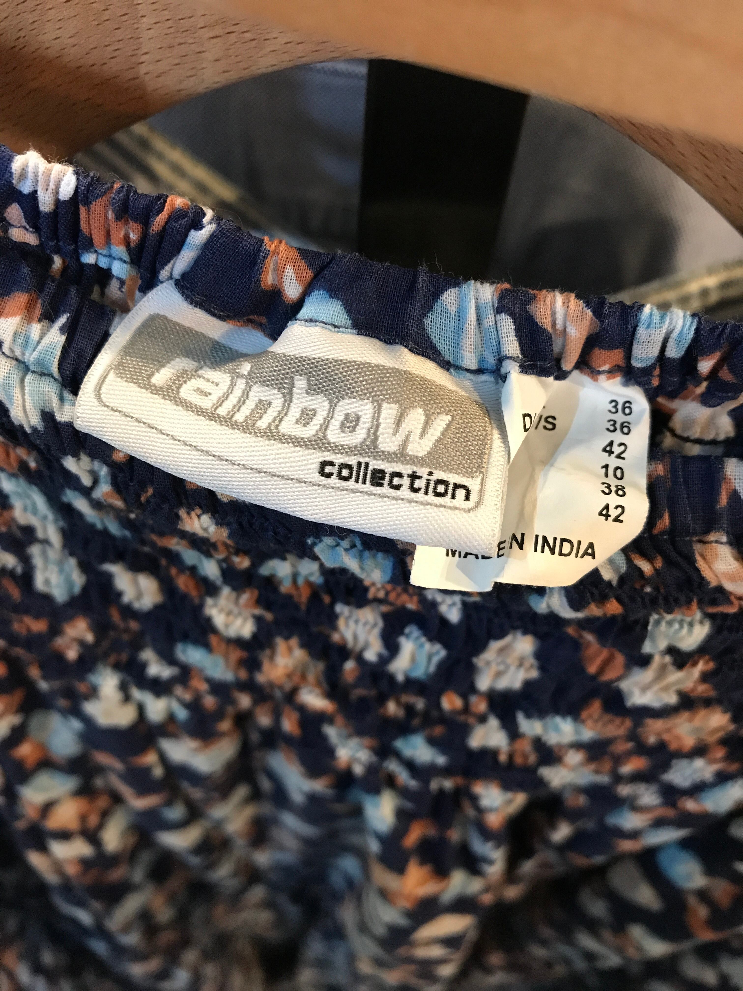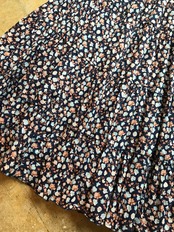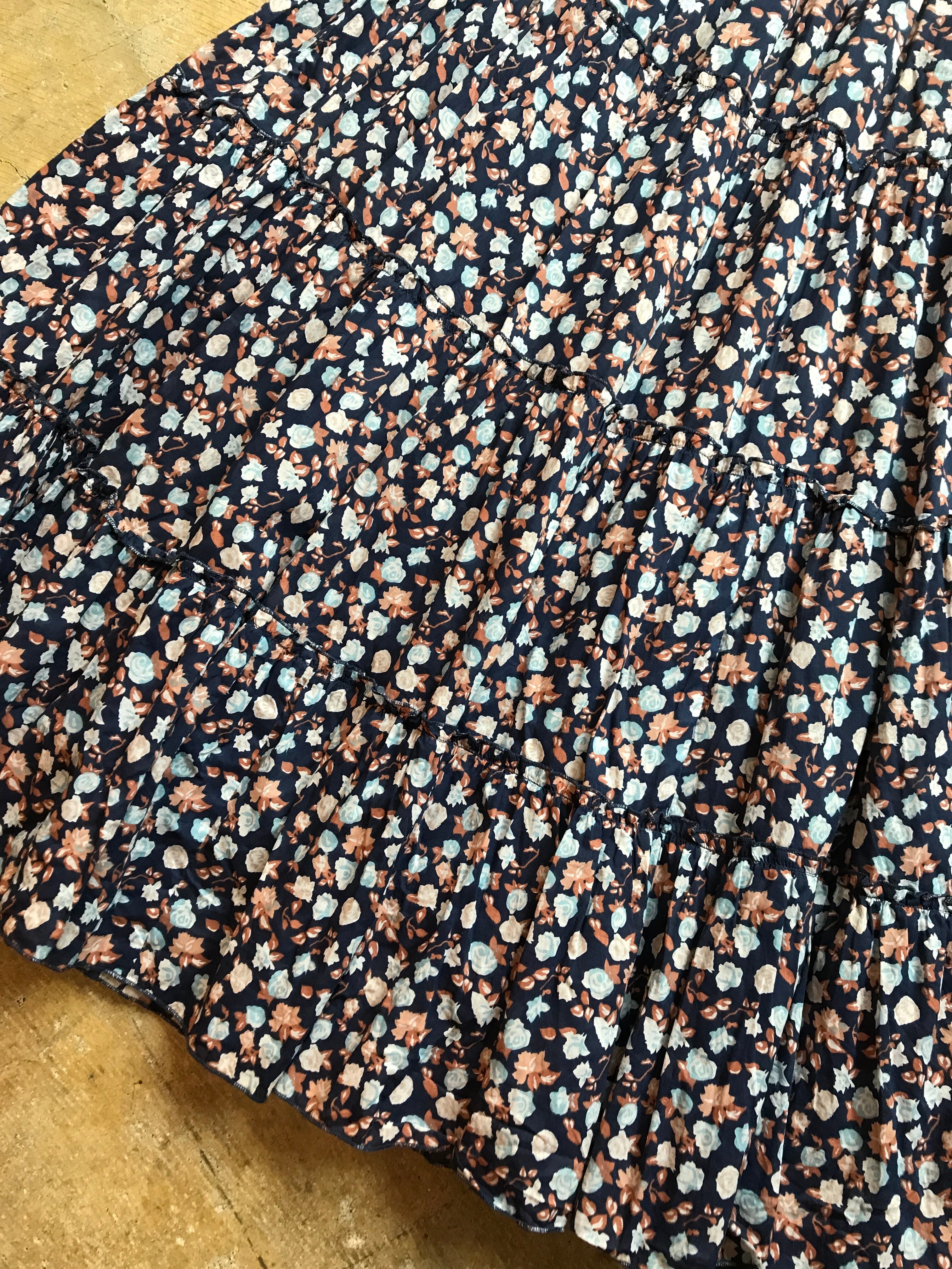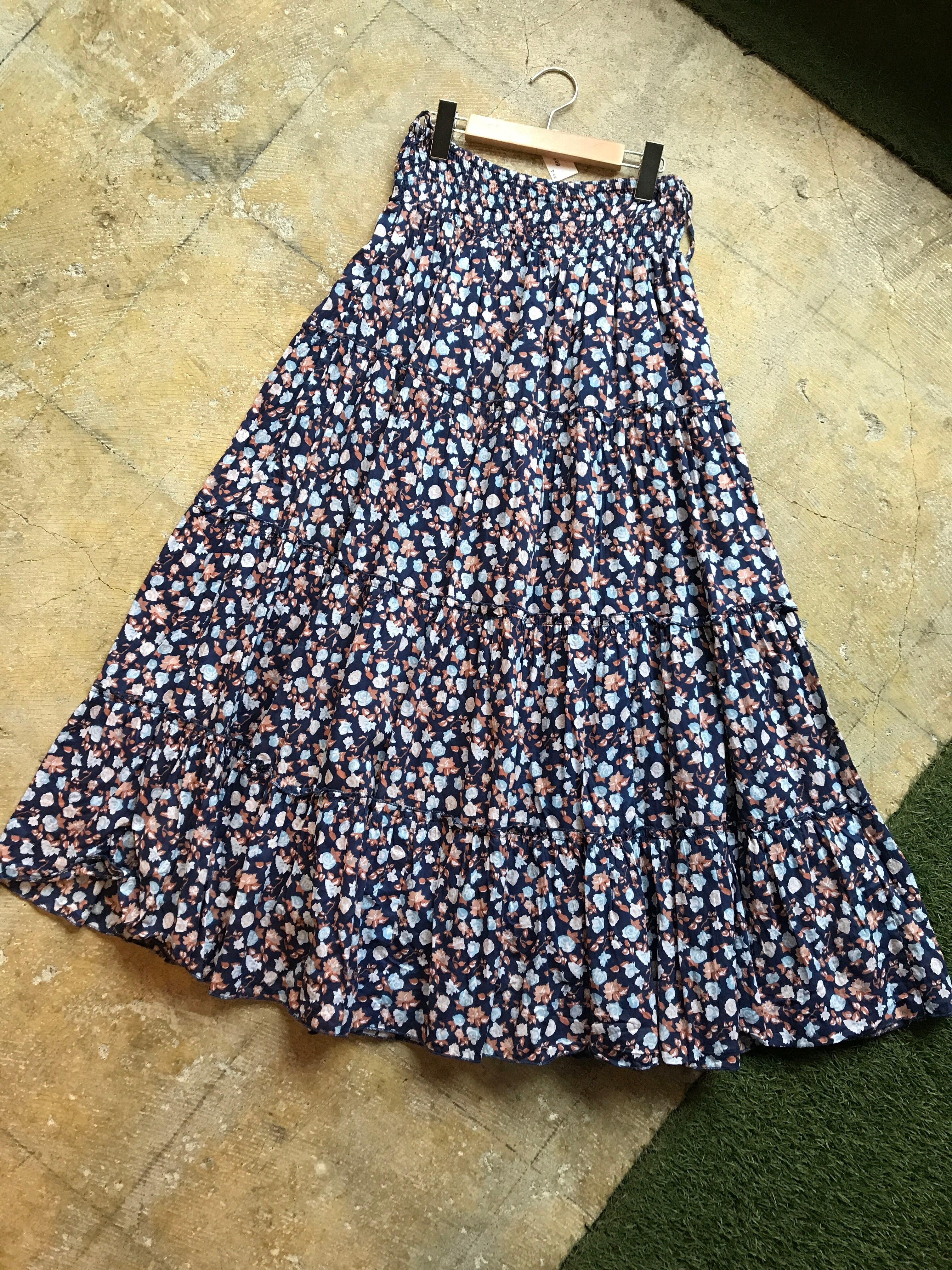 ヨーロッパのデザインロングスカートです。ネイビーベースの生地に細かめな花柄が素敵ですよね。ウエストはゴム仕様ですので着るのも楽チンです。人気のロング丈です。是非。