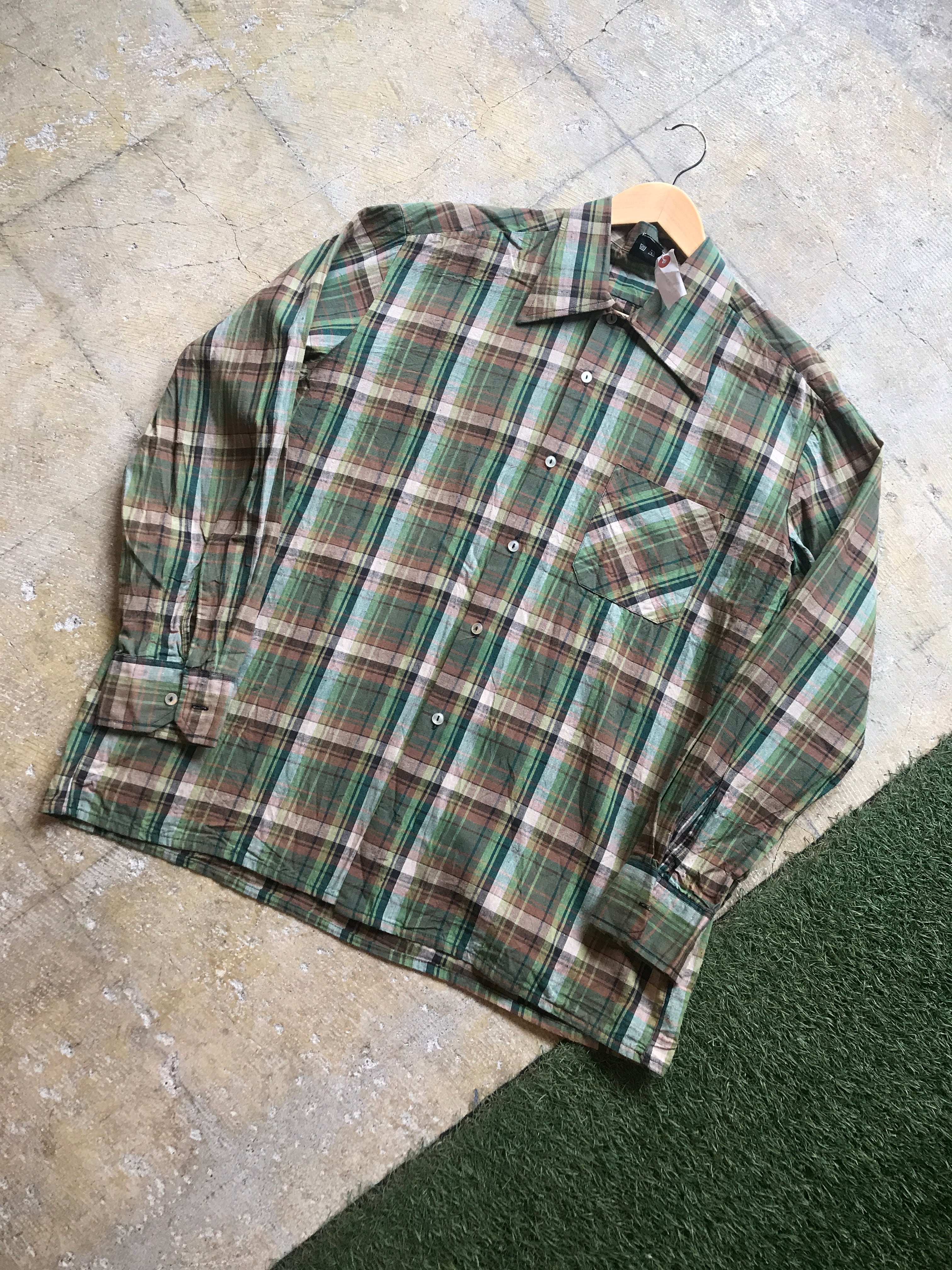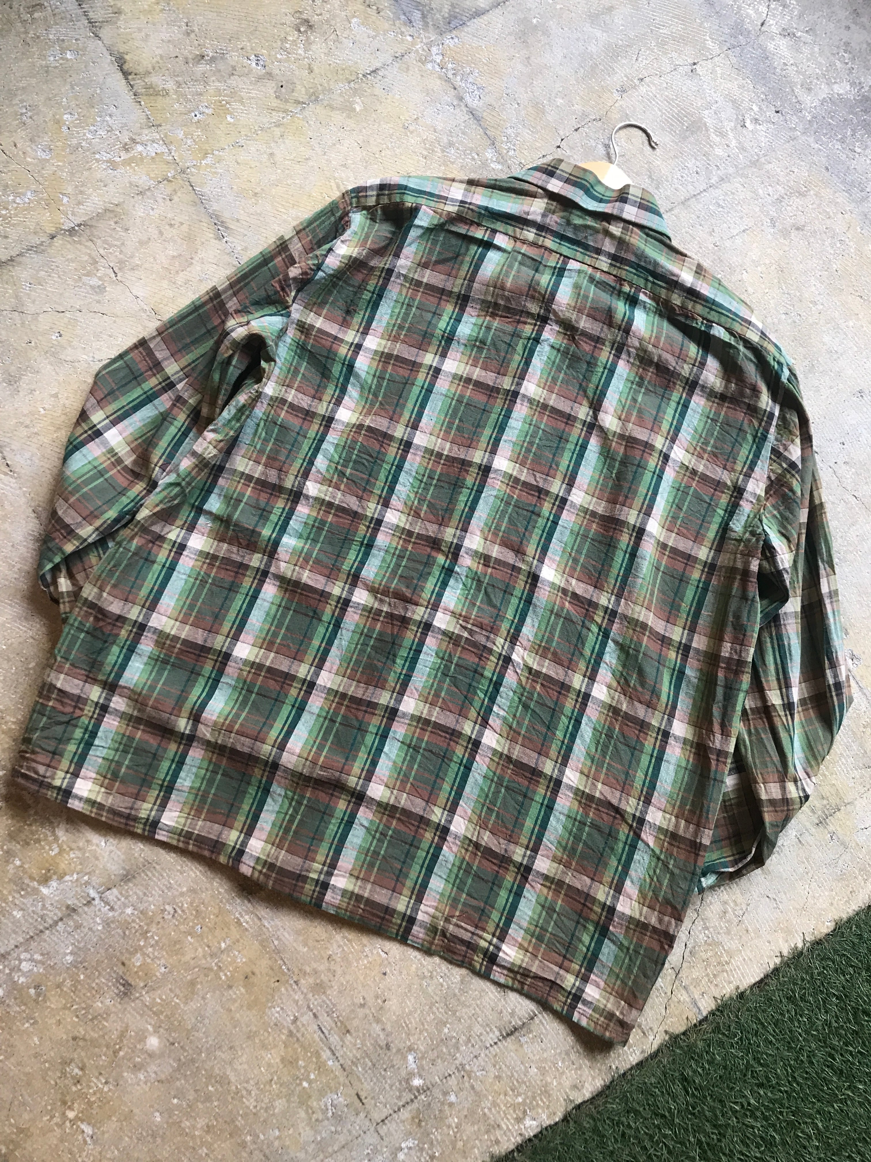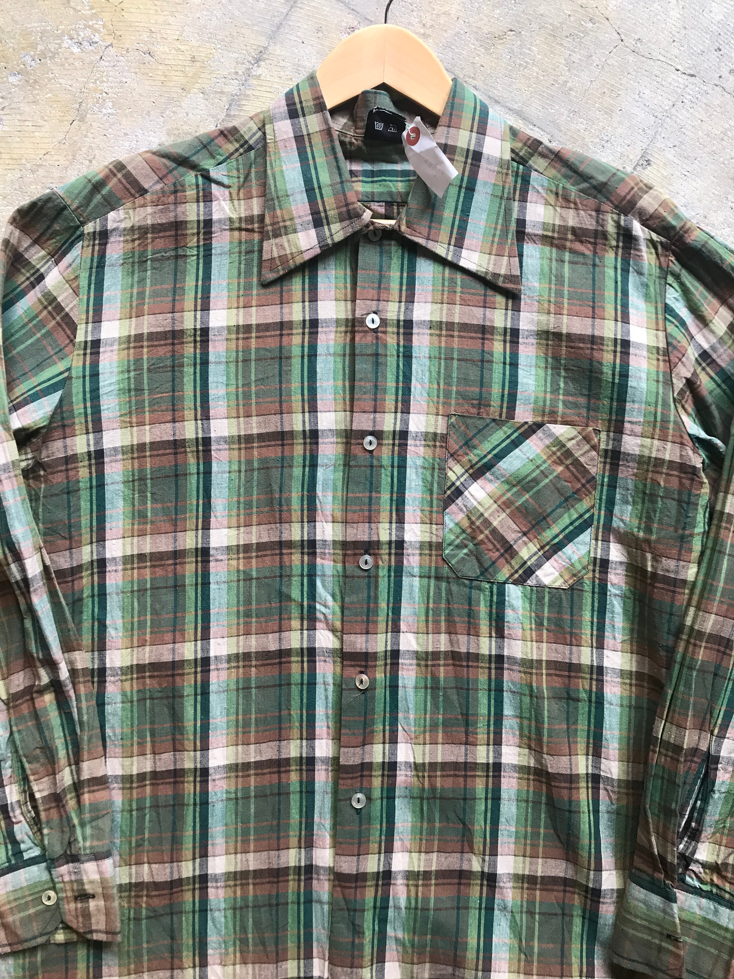 ヨーロッパのリネンようなコットンのボックスシャツです。古着らしい凝ったカラーリングは他人と被ることはありませんよ。程よい大きさにリネンに似たコットンの着心地がやみつきになりますよ。夏の主役のアイテムですね。ぜひ。