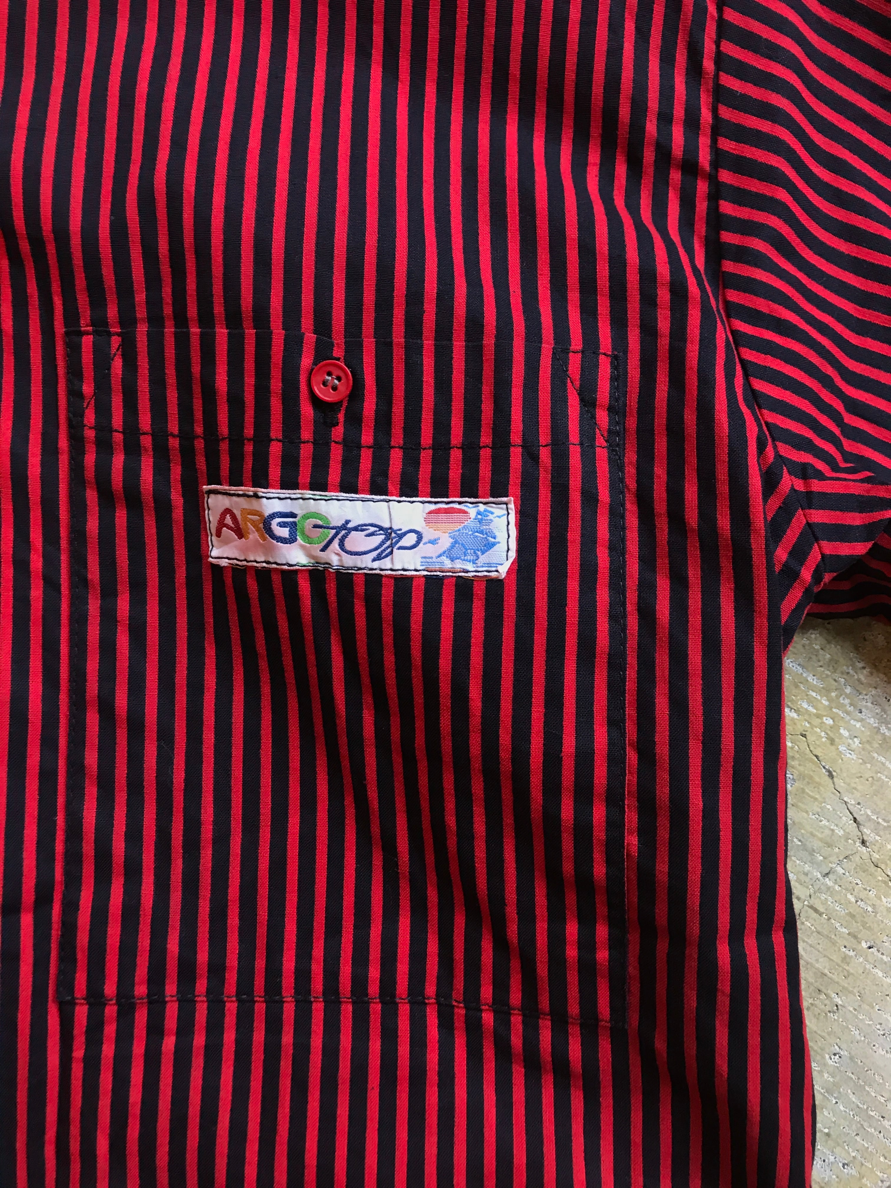 ヨーロッパのデザインシャツです。小ぶりな襟に胸のワンポイントがアクセントになり、素敵なシャツに仕上がっていますよ。赤のストライプですのでユーロのインクブルーのワークパンツと合わせていかがでしょうか?ぜひ。