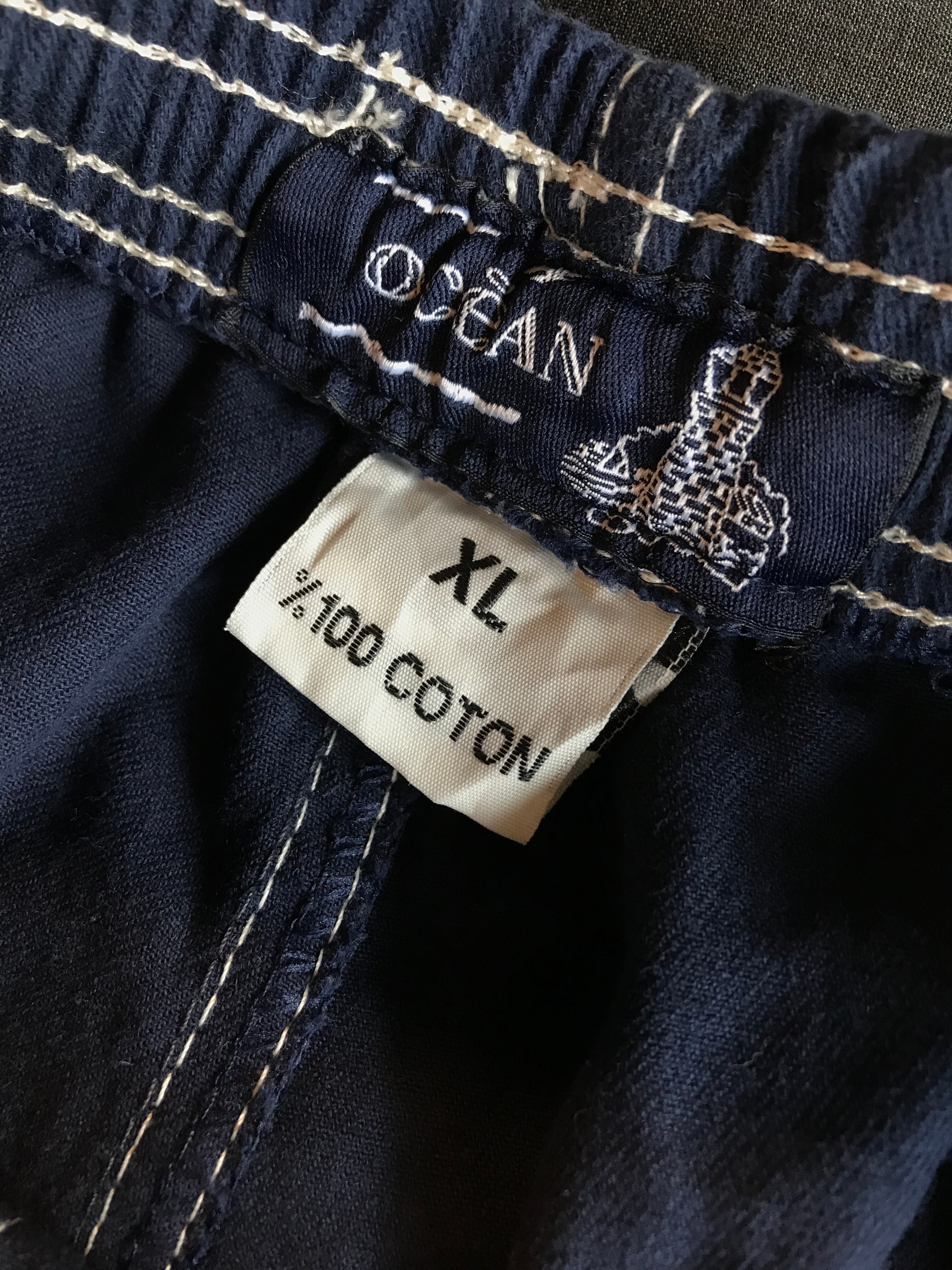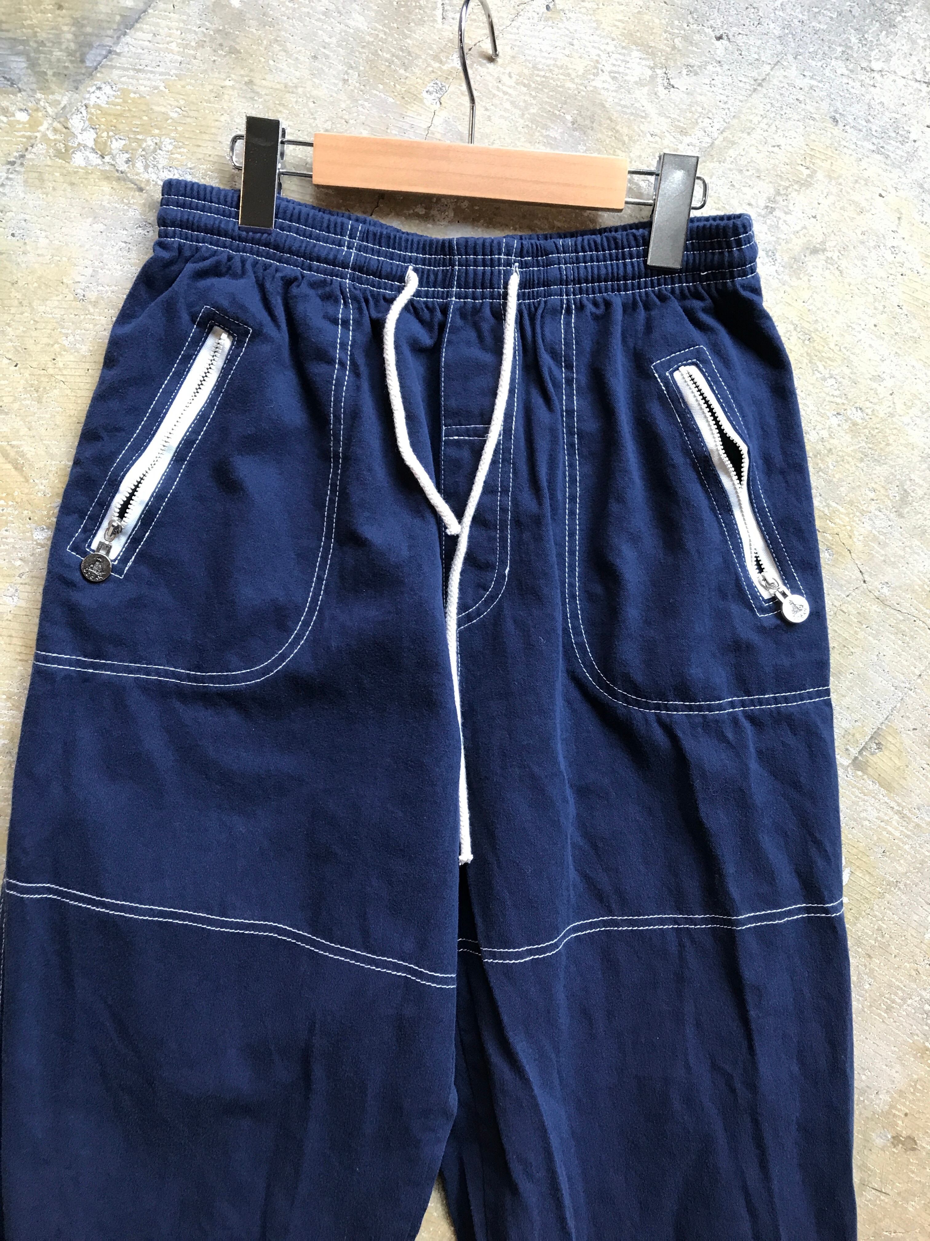 ユーロのイージーパンツです。ネイビーベースに白のステッチがモダンで素敵ですよ。シルエットもテーパードがかかっていて綺麗です。XLですが全然大きくないですよ。ぜひ。