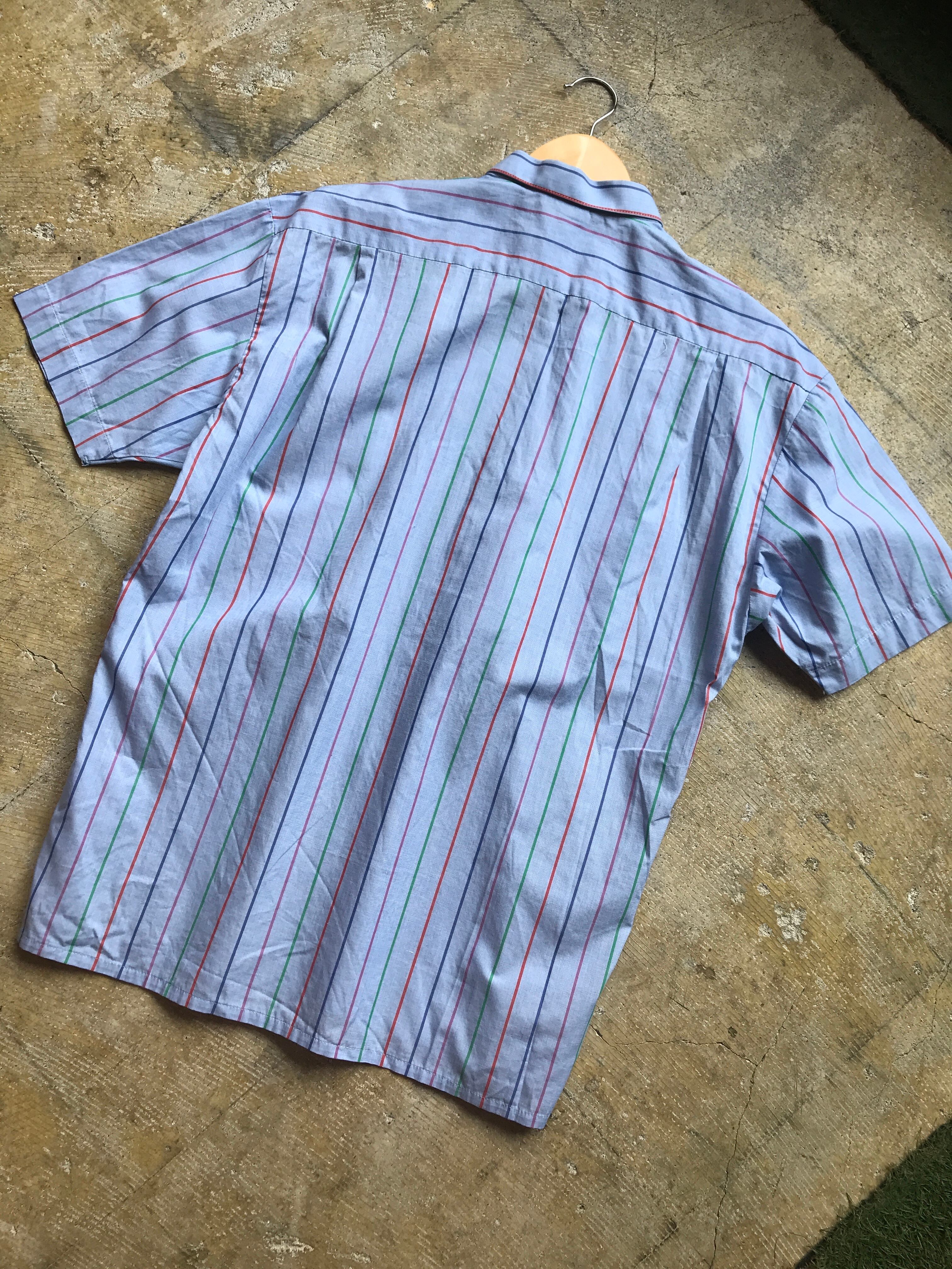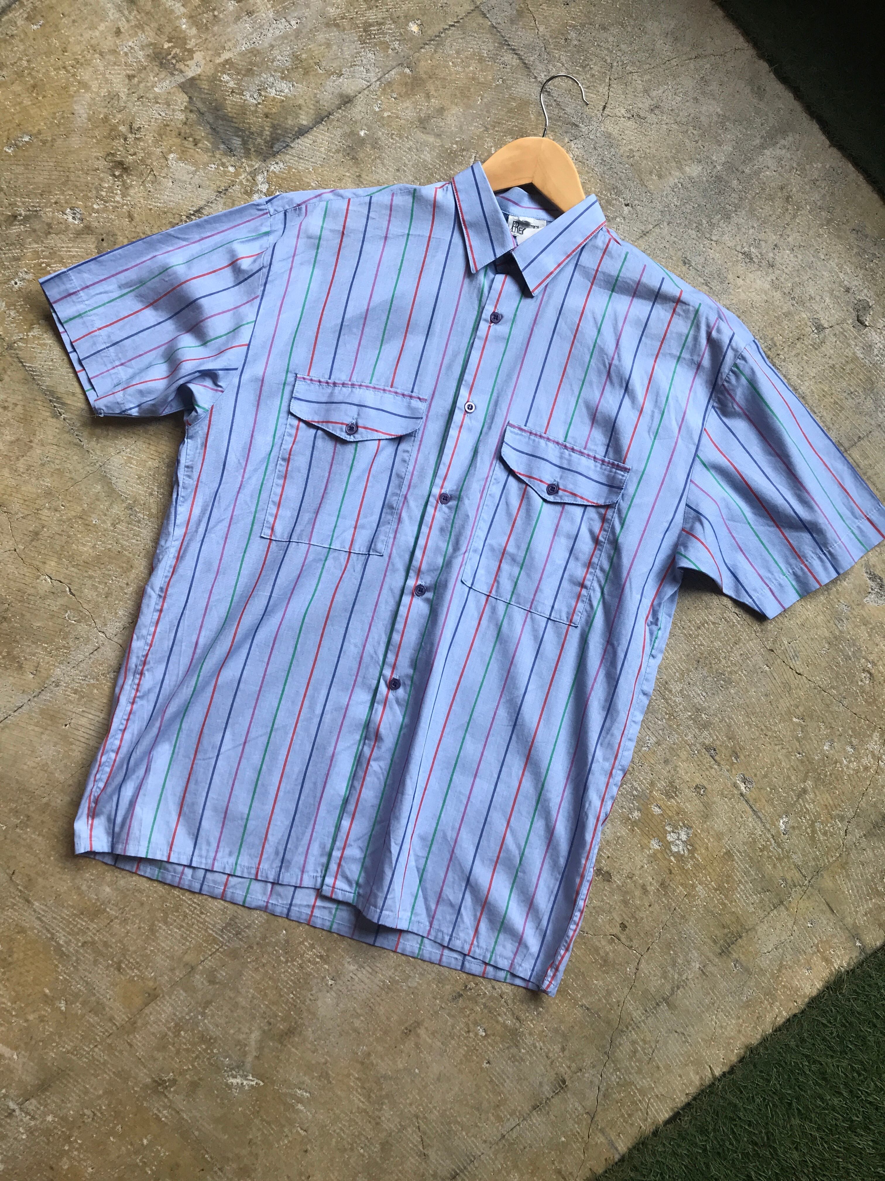 ヨーロッパのデザインシャツです。マルチカラーのストライプが素敵ですね。嬉しいボックスシルエットも見逃せません。他人と被りたくない方はぜひ。