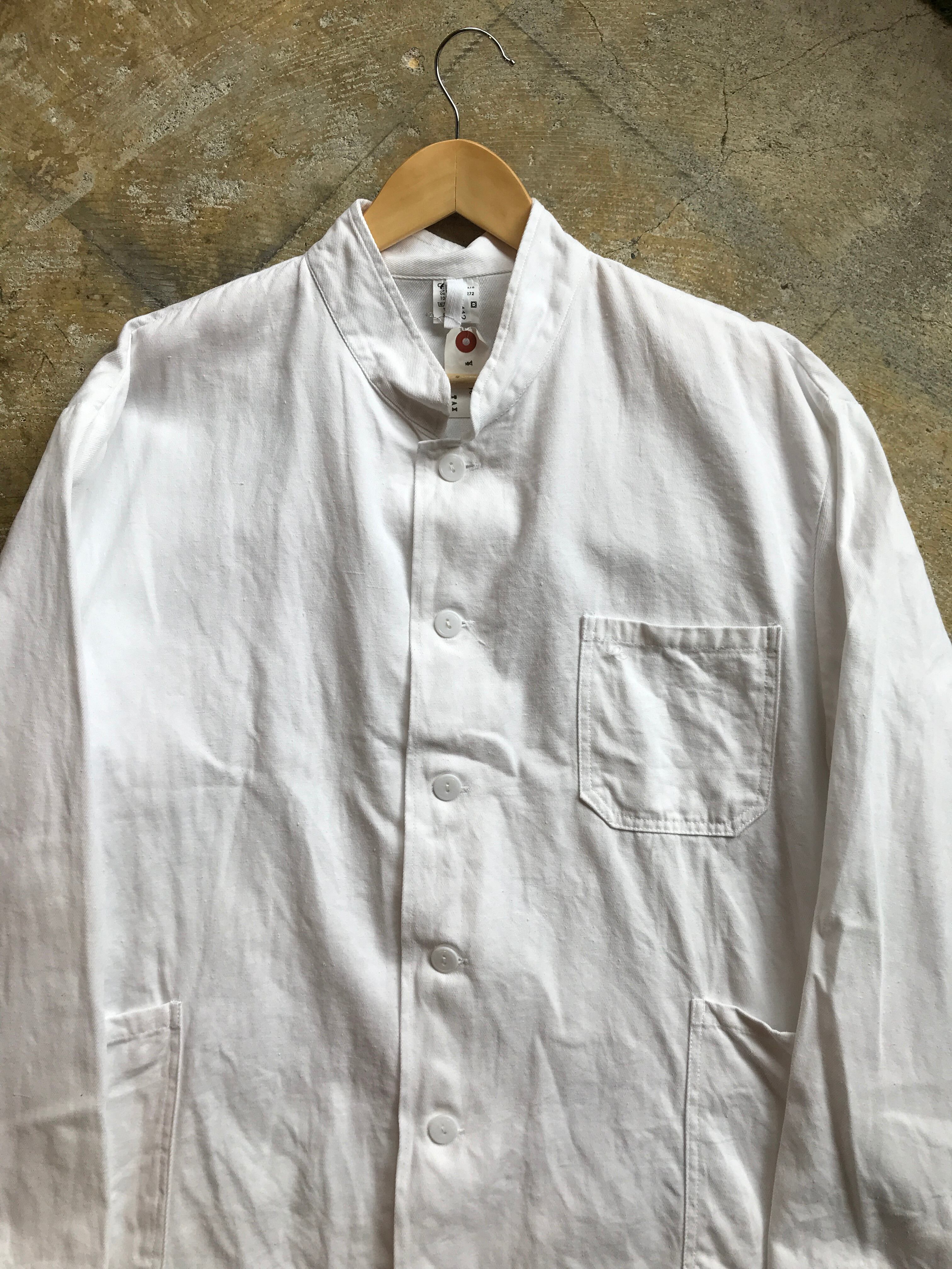 デットストックのチェコ軍のシェフジャケットです。カバーオールのディティールに特徴的なスタンドカラーの襟は従来のシェフジャケットとは違い洗練されていますよ。大きめの身幅でこれからも着れる薄いコットンが魅力的です。是非。