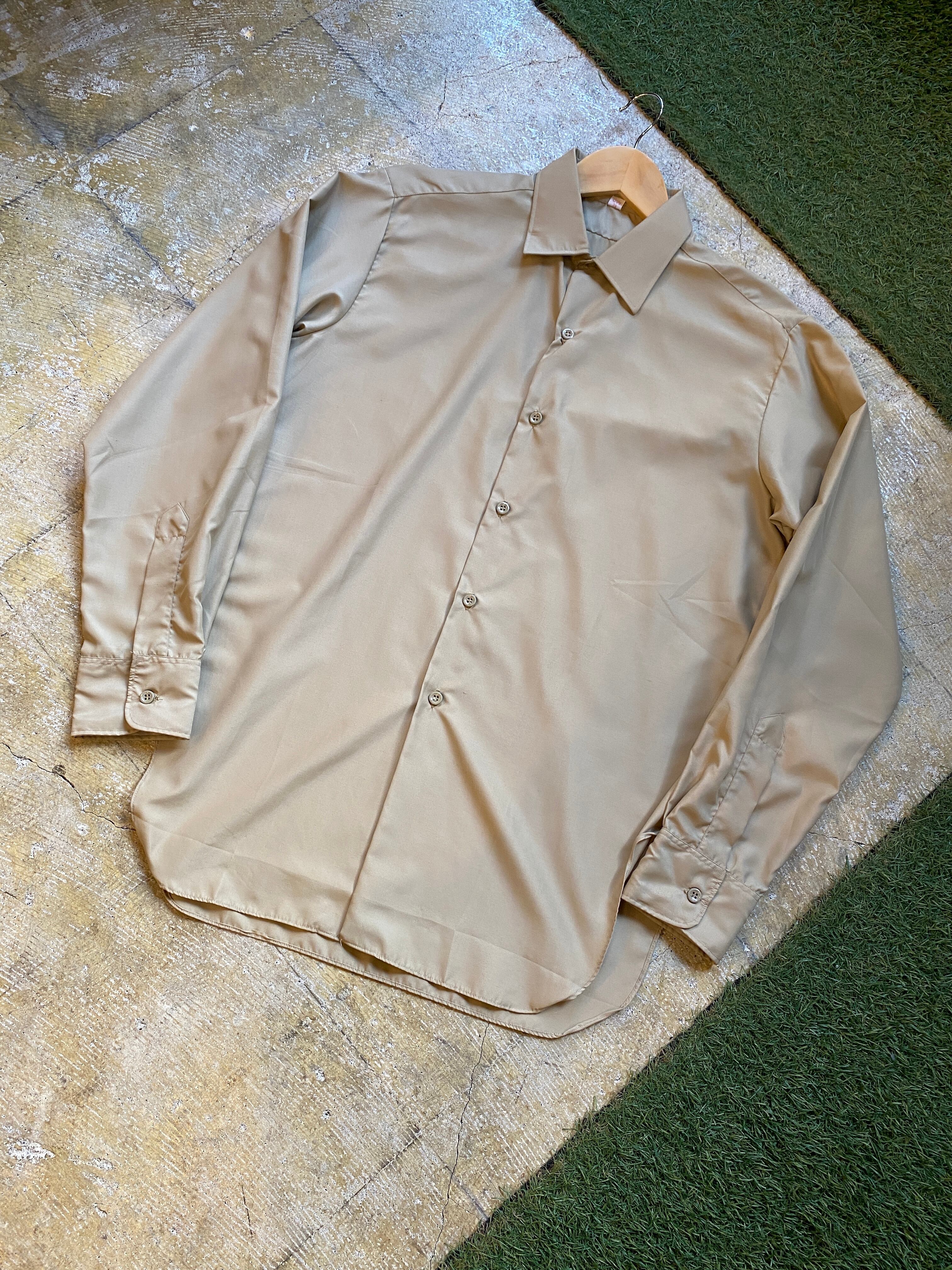 ヨーロッパのデザインシャツです。ナイロンのようなシャリっとした生地感はモードに着れる1枚ですよ。タックインしても素敵ですね。普遍的ですが人被らないシャツです。是非。
