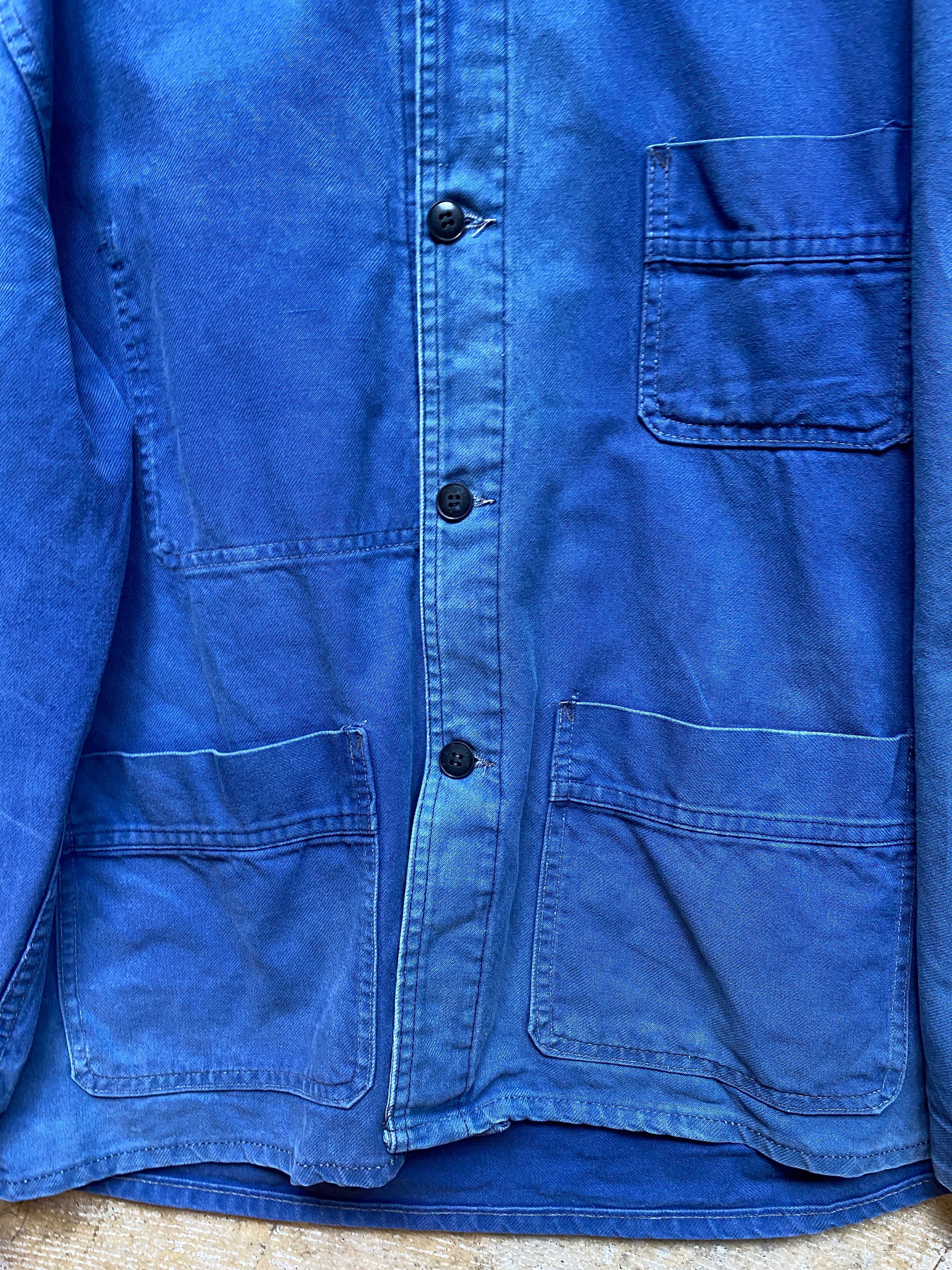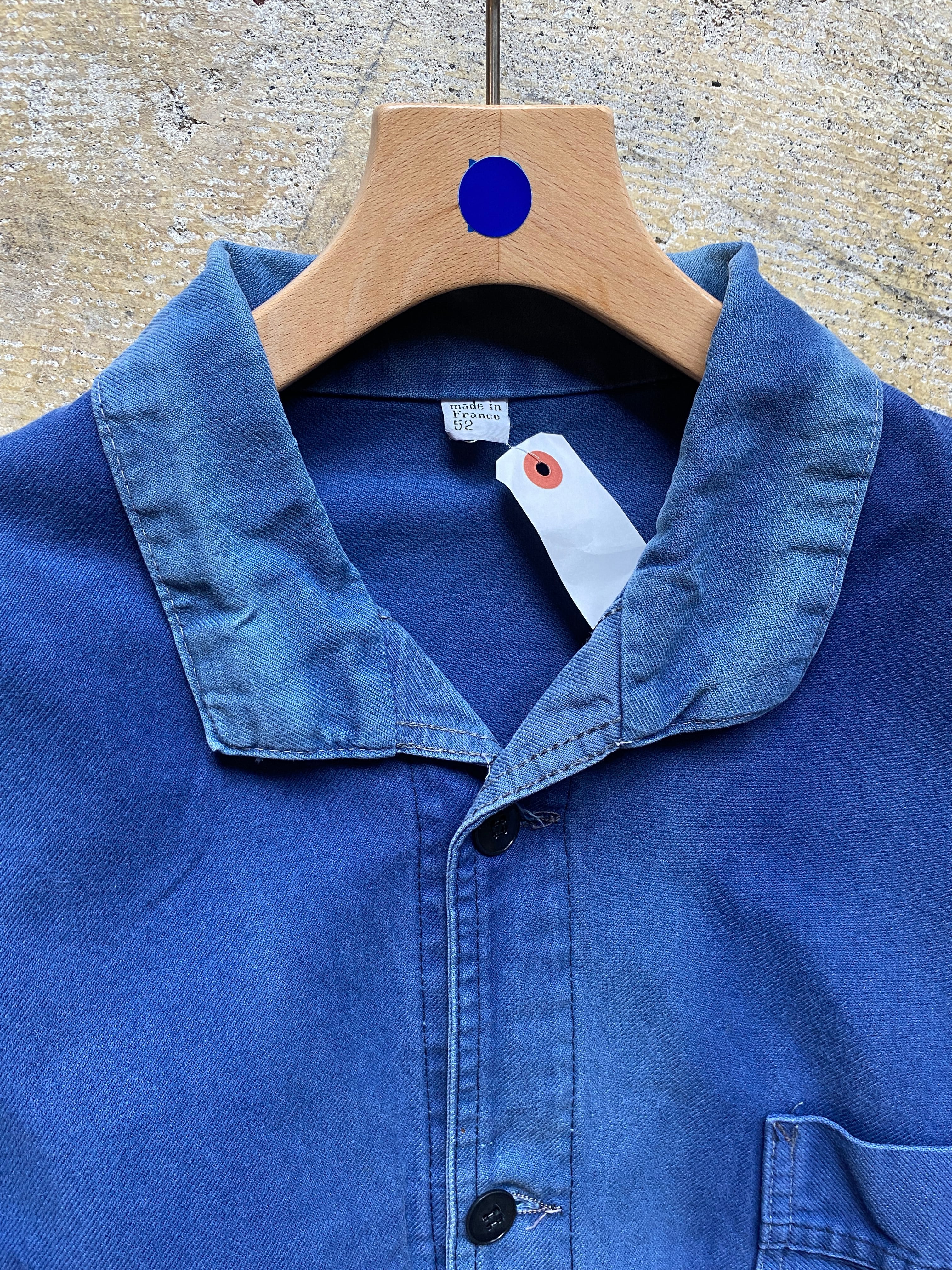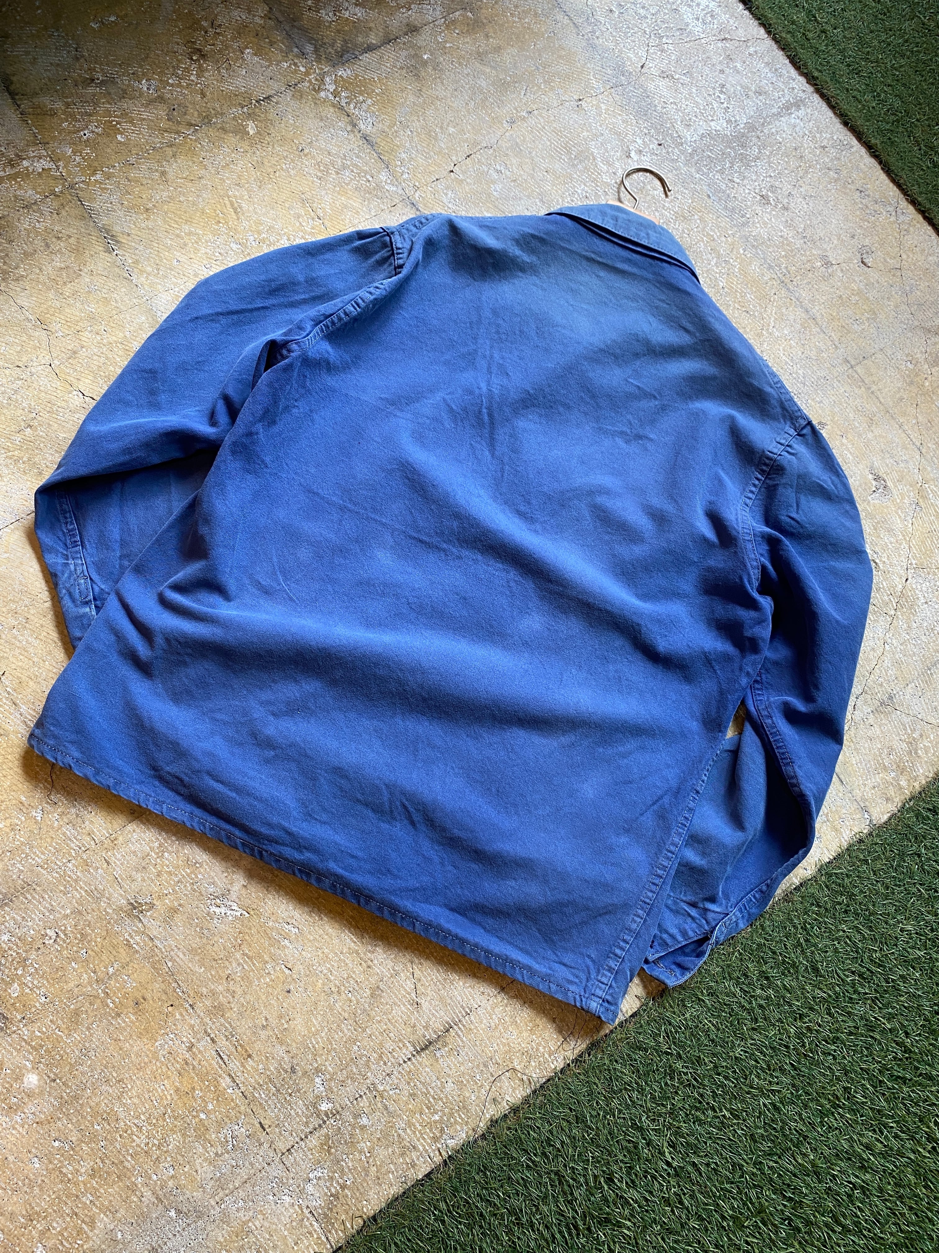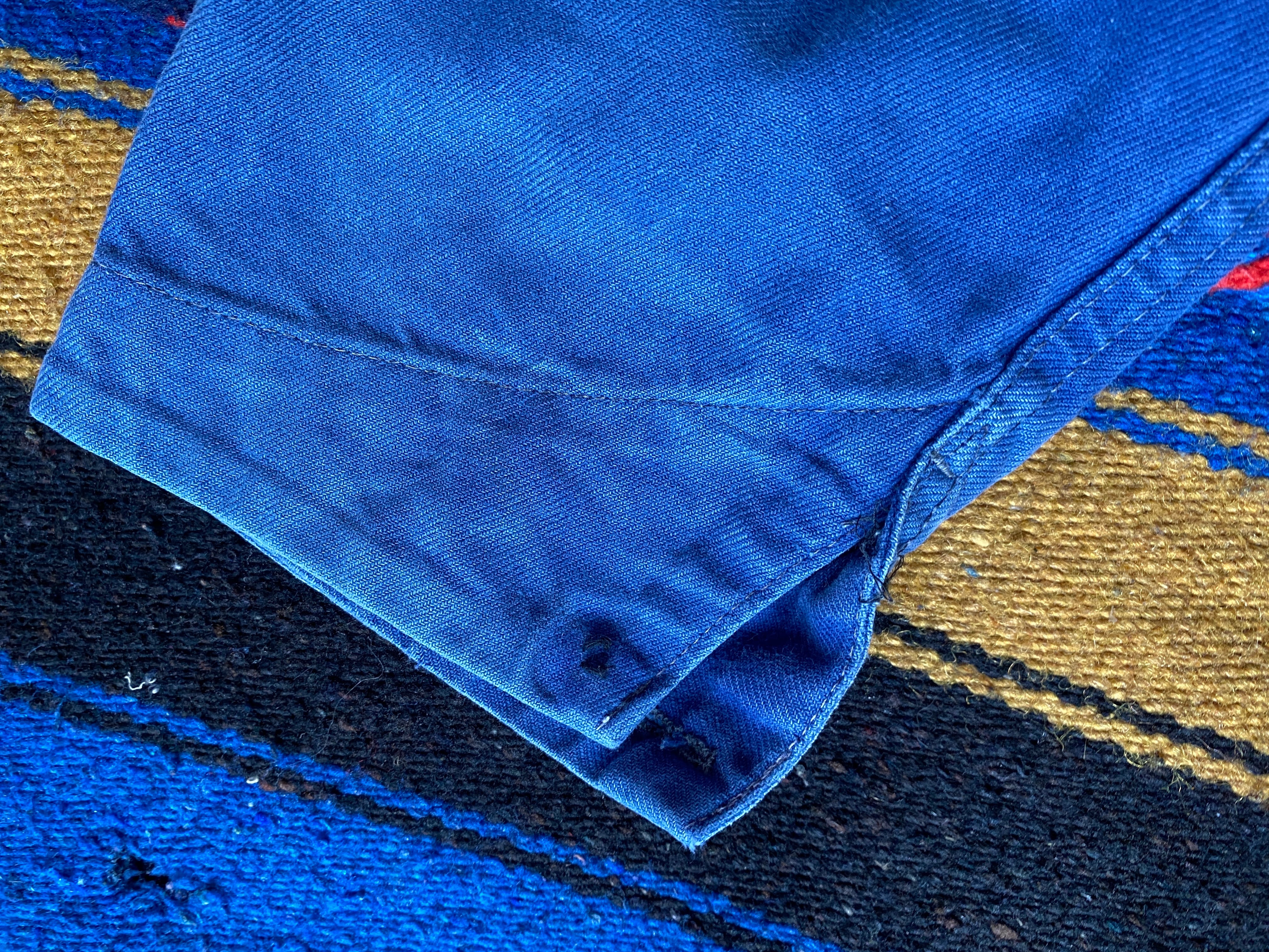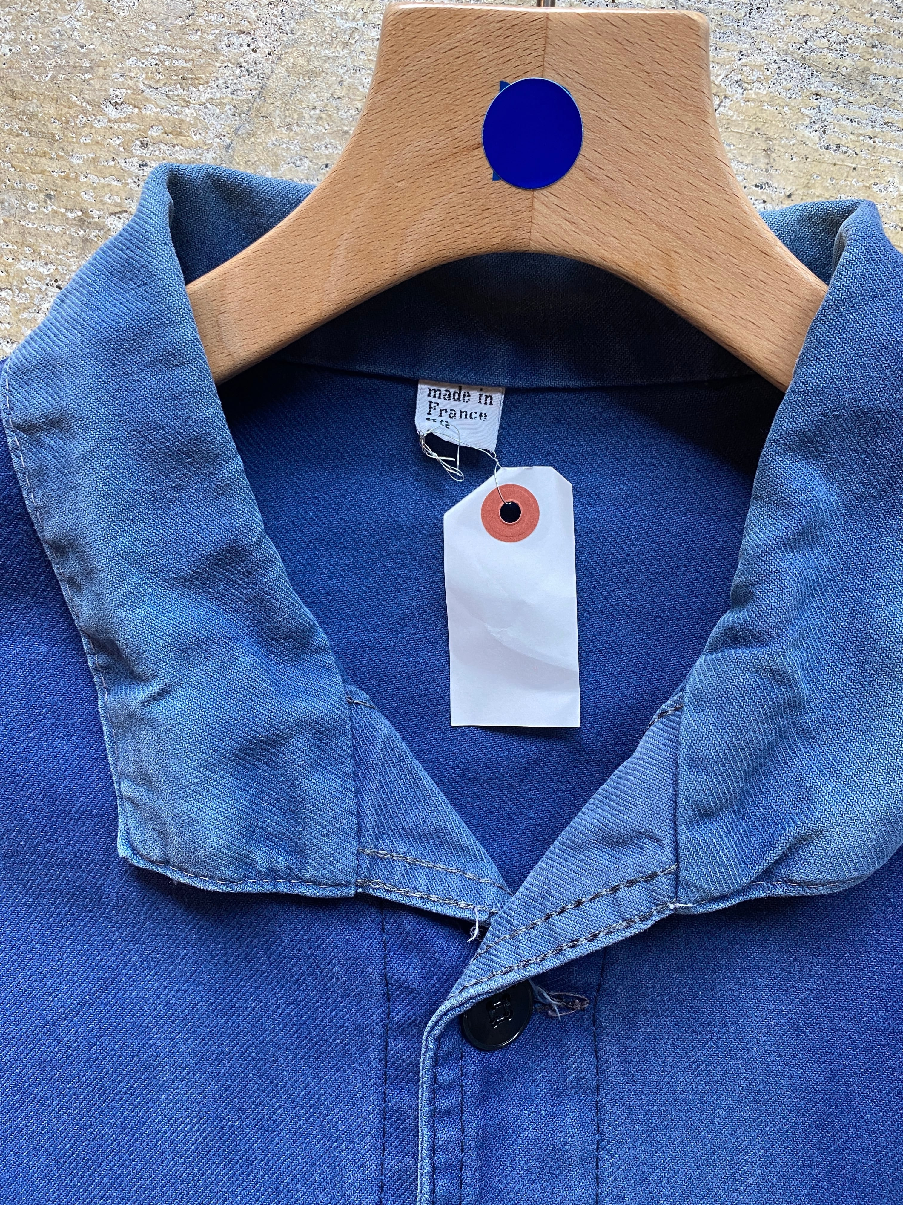 人気のフレンチワークジャケットです。生地はコットンツイルで珍しい襟の形で立てて着てもかっこいいです。色落ちもかなりオーラがある感じに落ちています。サイズも大きめですのでお好きな方いかがでしょうか?是非。