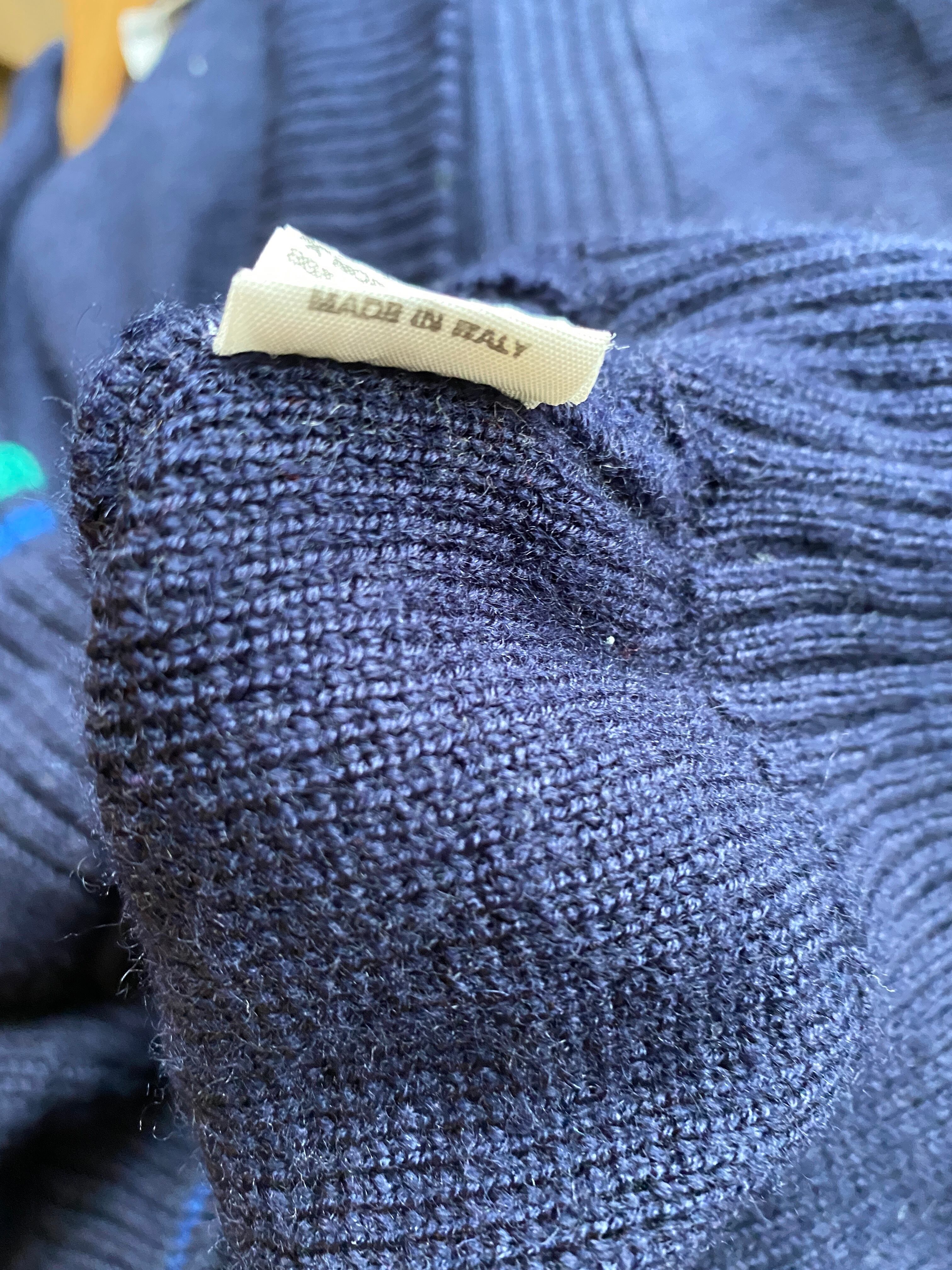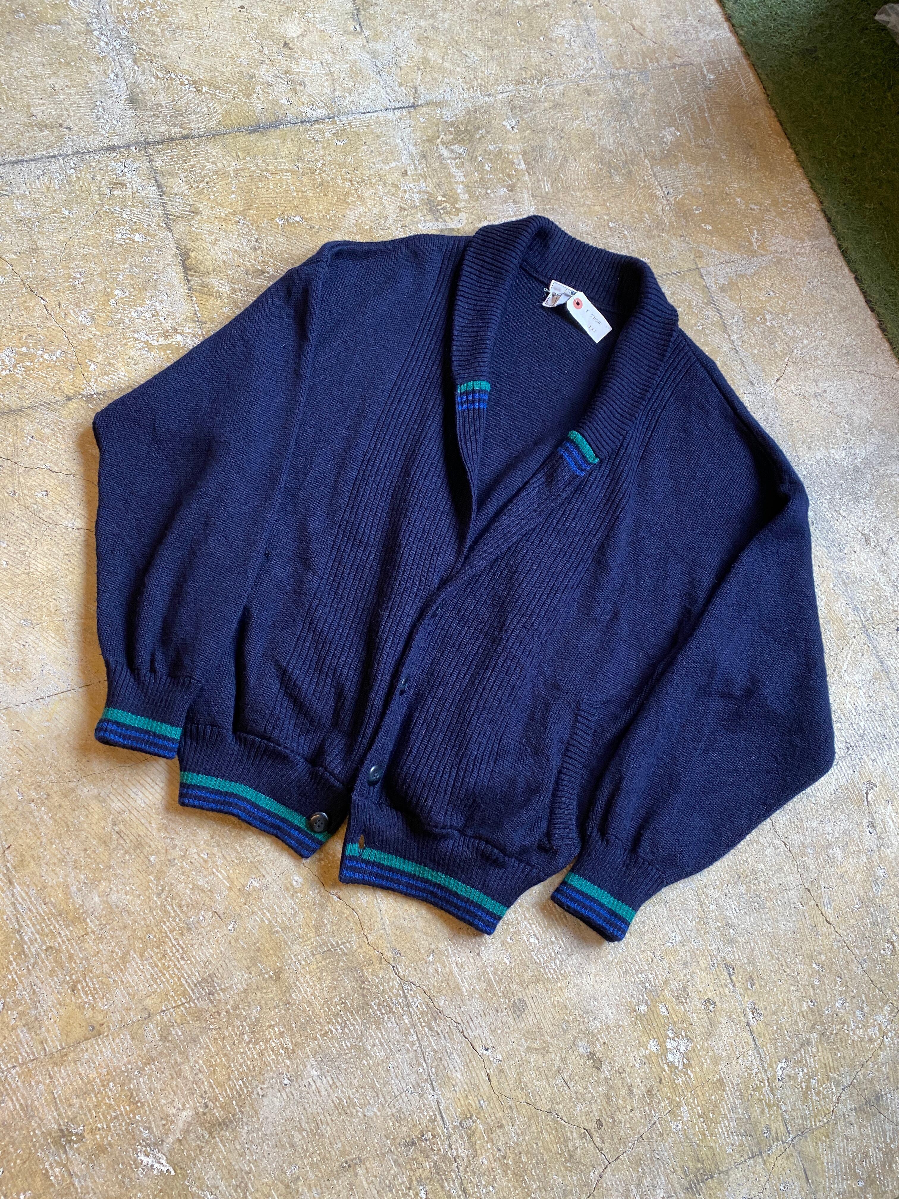 ヨーロッパはイタリア製のデザインカーディガンです。ネイビーにラインが入って素敵ですね。生地も厚めですがコートの中に忍ばせられる厚さですよ。是非。