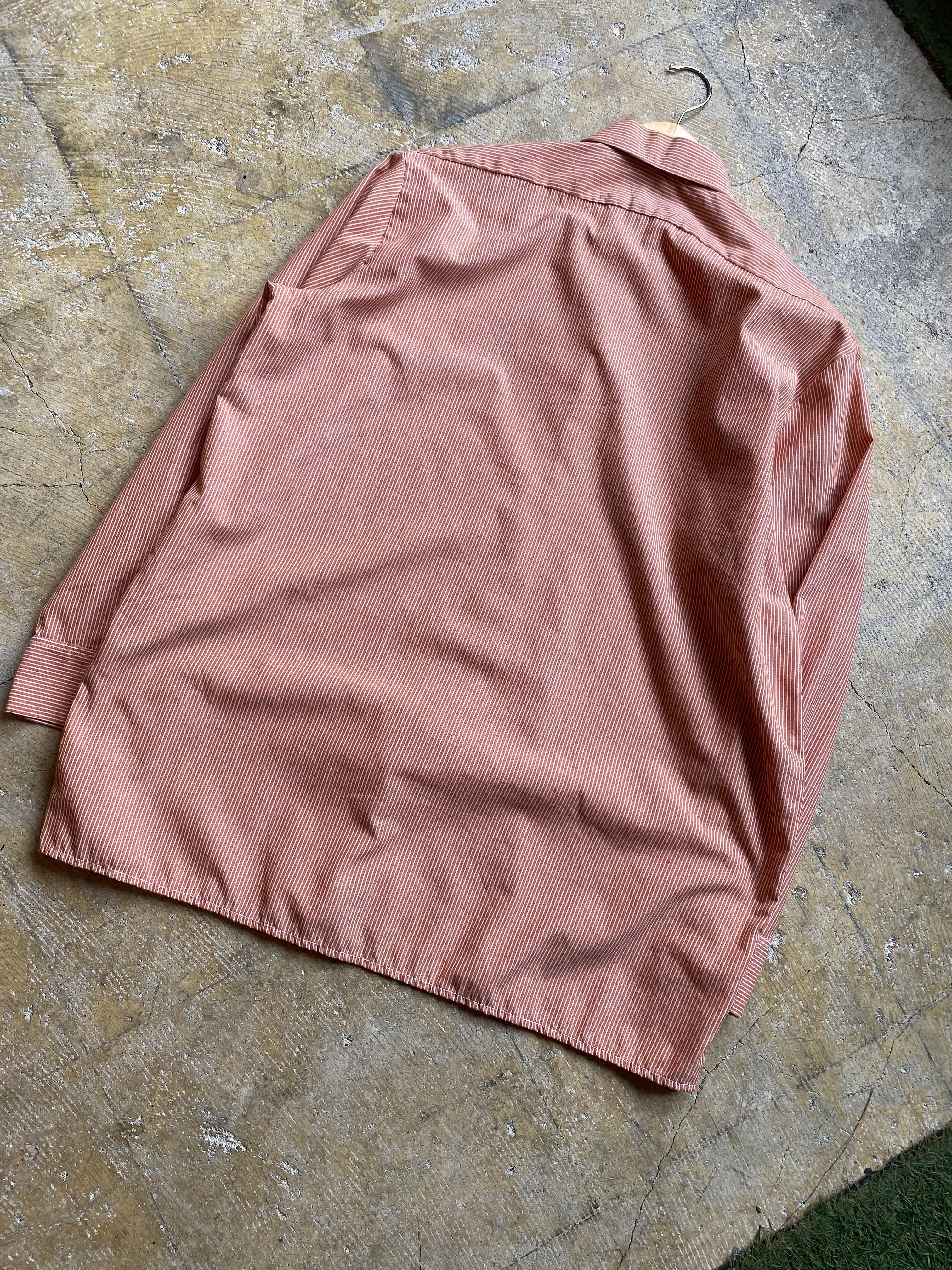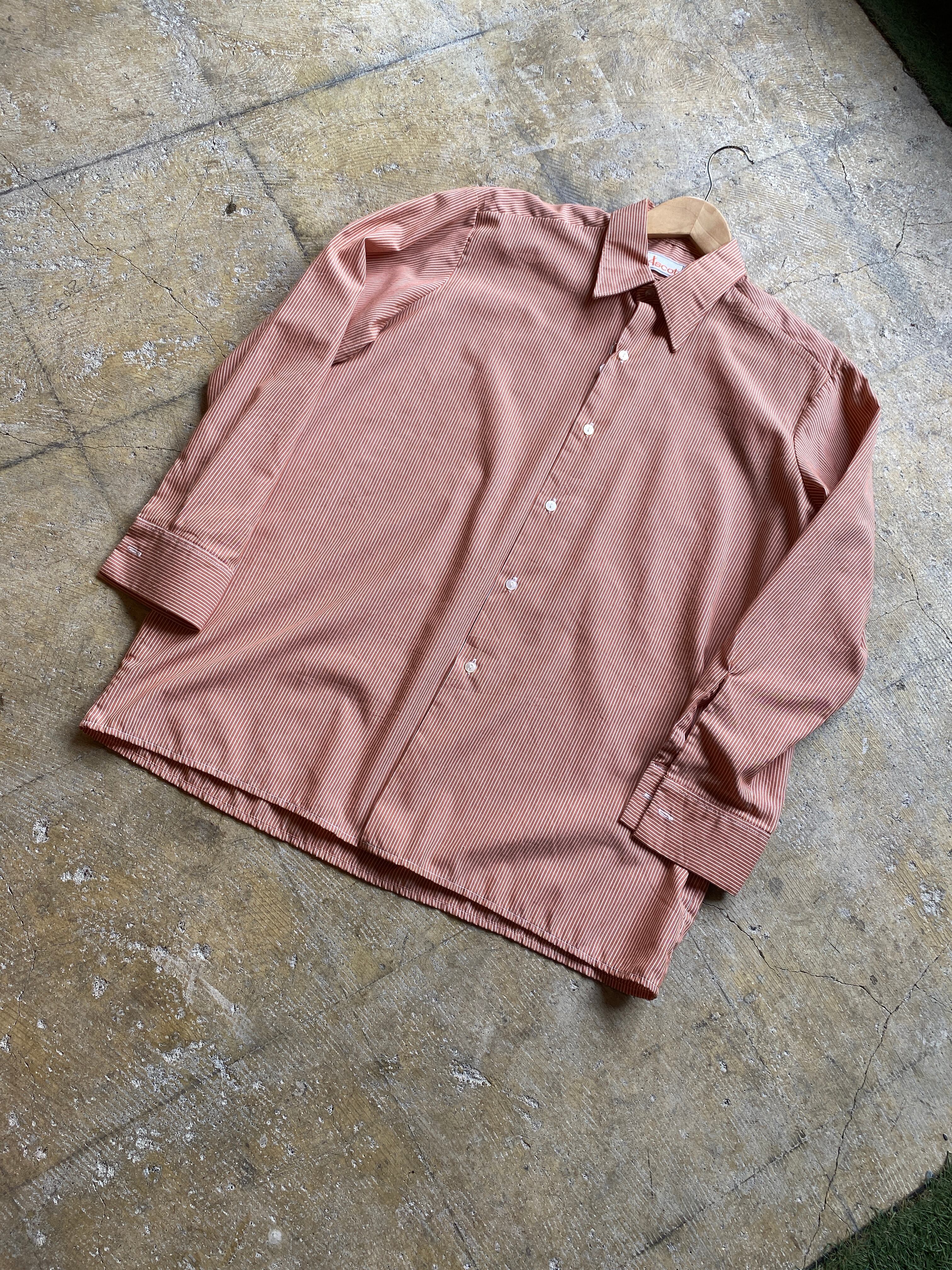 綺麗目なユーロのデザインシャツです。細いピッチにあまりないオレンジのストライプが素敵ですね。ボックスシルエットも嬉しいです。ぜひ。
