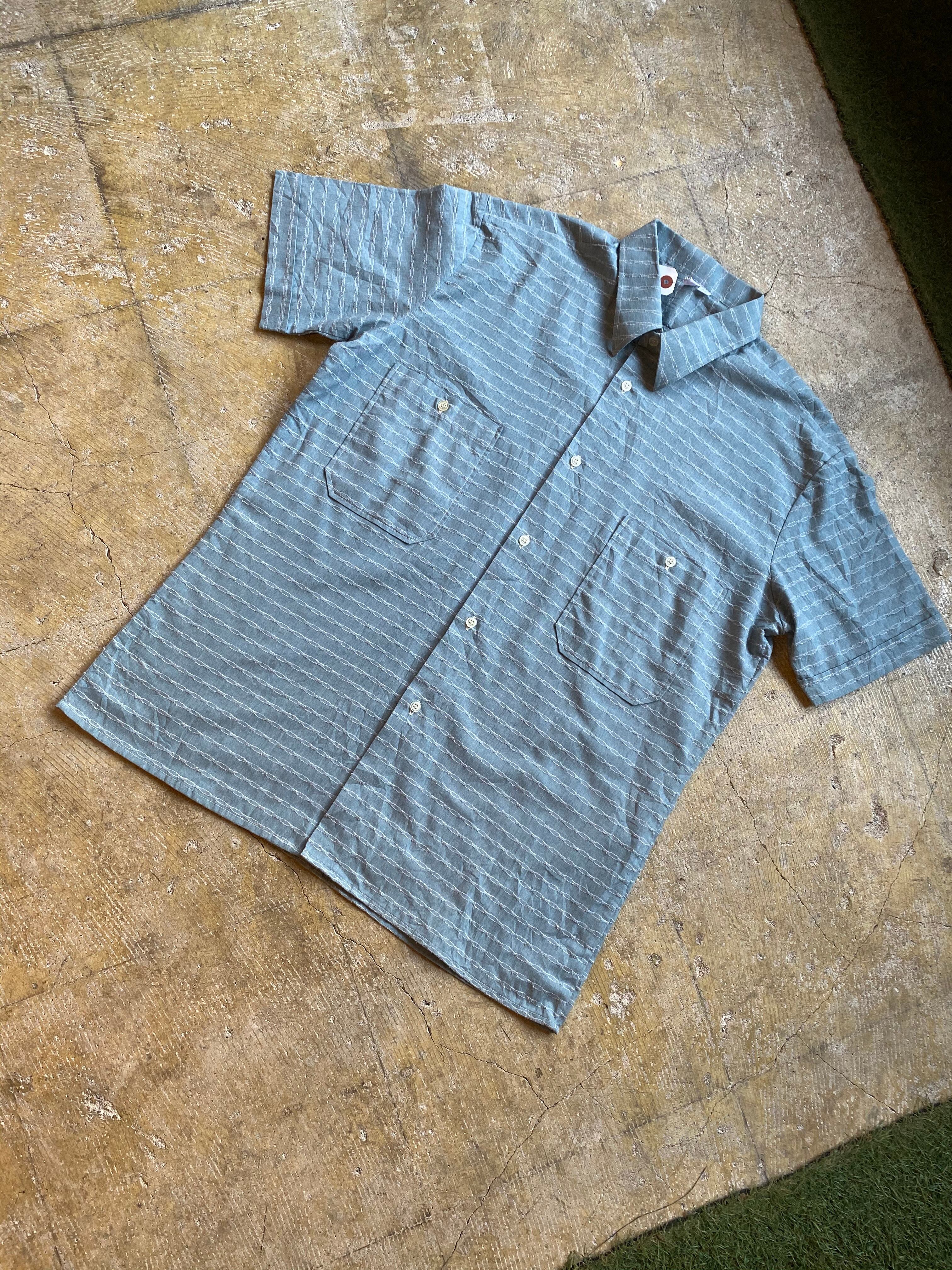 ヨーロッパのデザインシャツです。凸凹した生地感に爽やかな色味が夏らしく素敵ですね。胸の2ポケットも個人的には◎です。ぜひ。