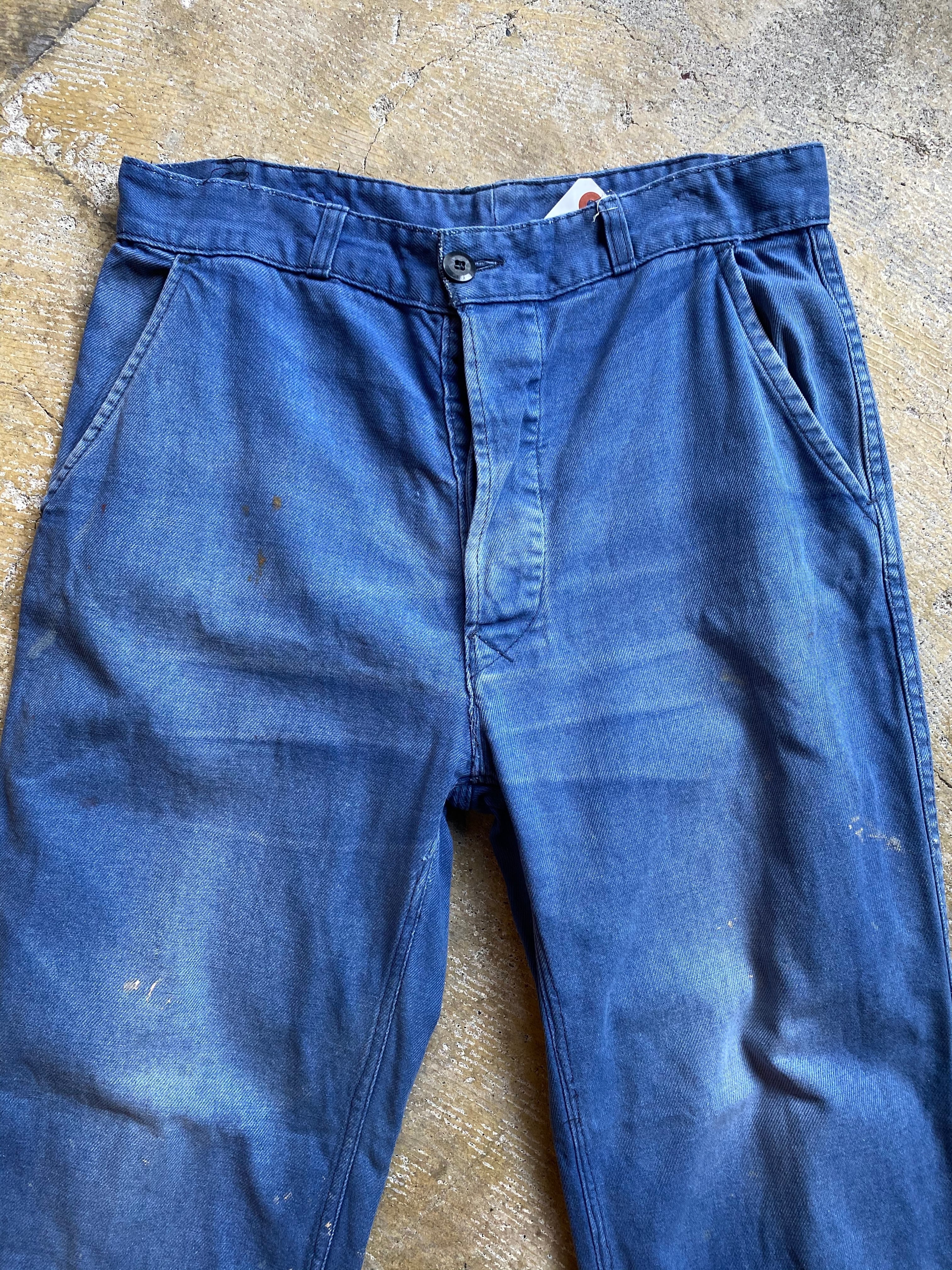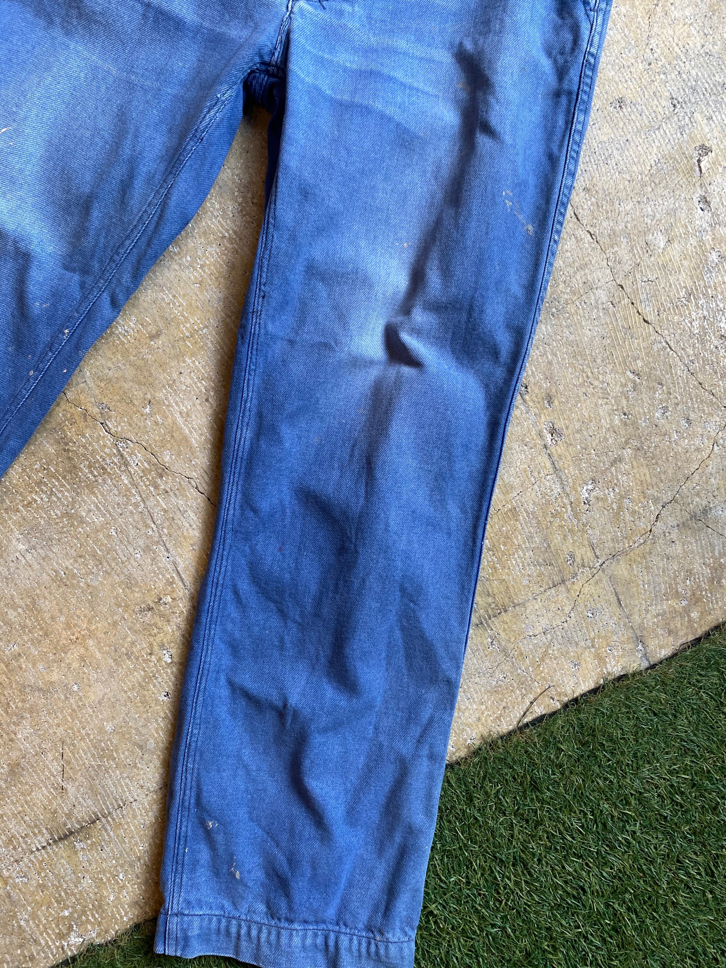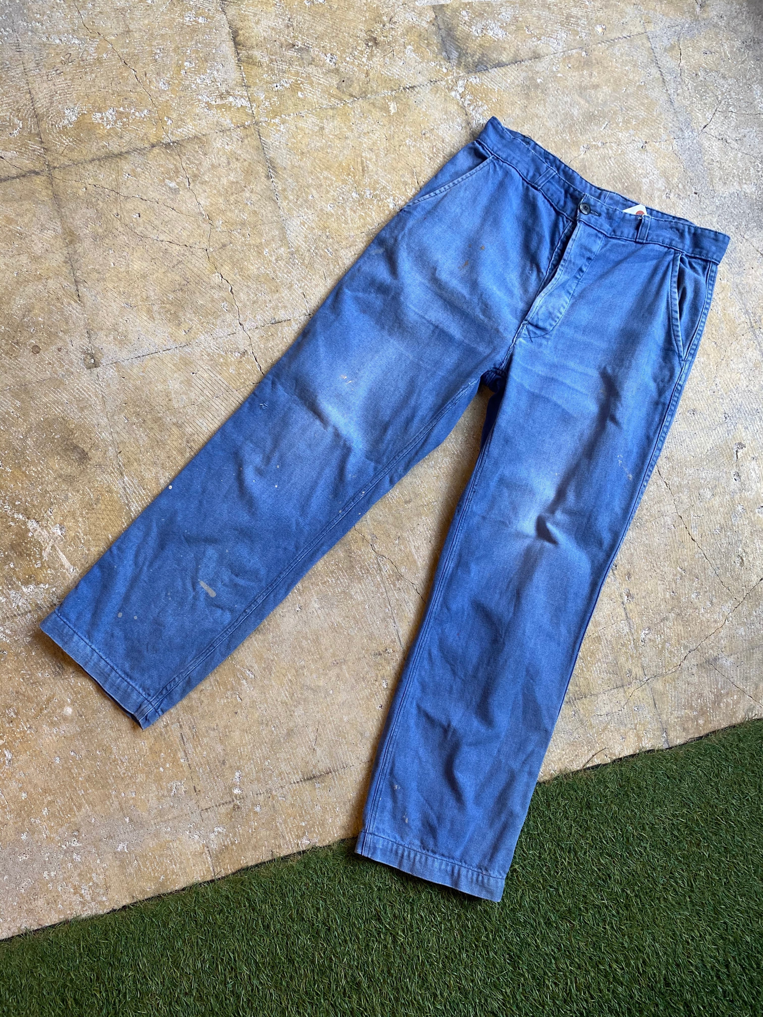 フランスのワークパンツです。程よいフェードある生地にサイズバランスが最高ですよ。夏用のフレンチワークですね。色は1枚目が実物に近いです。是非。