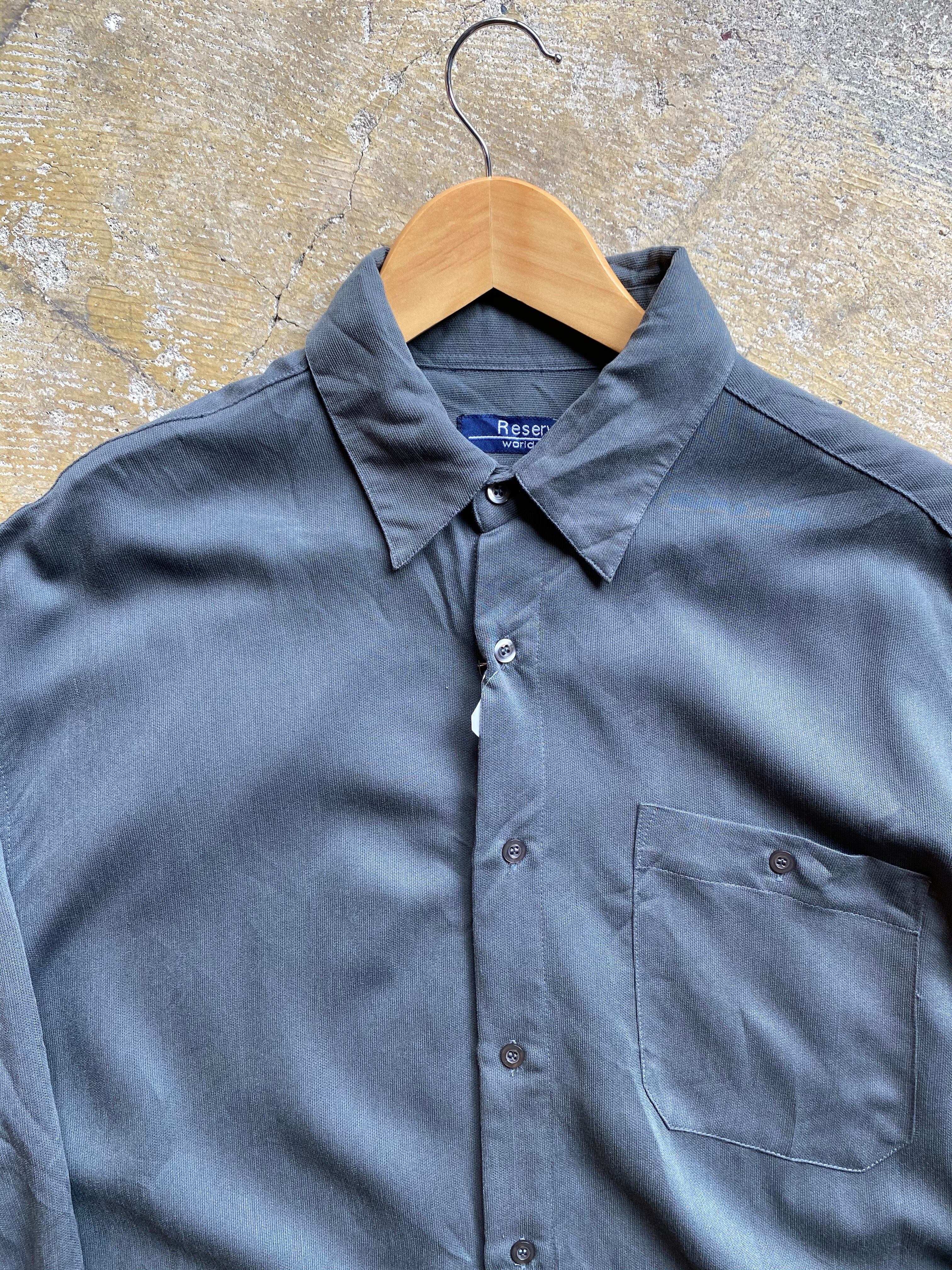 デザインレーヨンシャツです。グレーのカラーに綺麗なドレープが素敵ですよ。レギュラーからーなのでどんなスタイリングにも使えますね。3枚目が実物に近いカラーです。ぜひ。