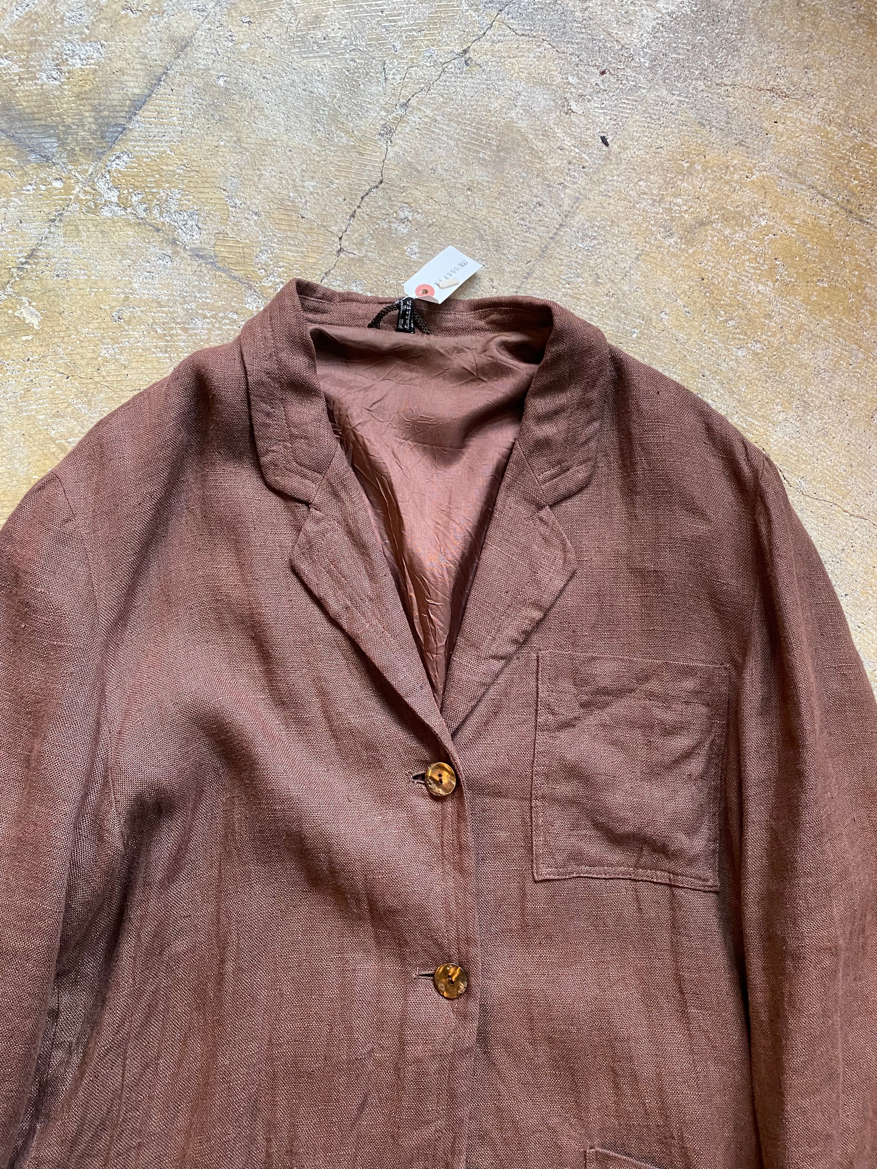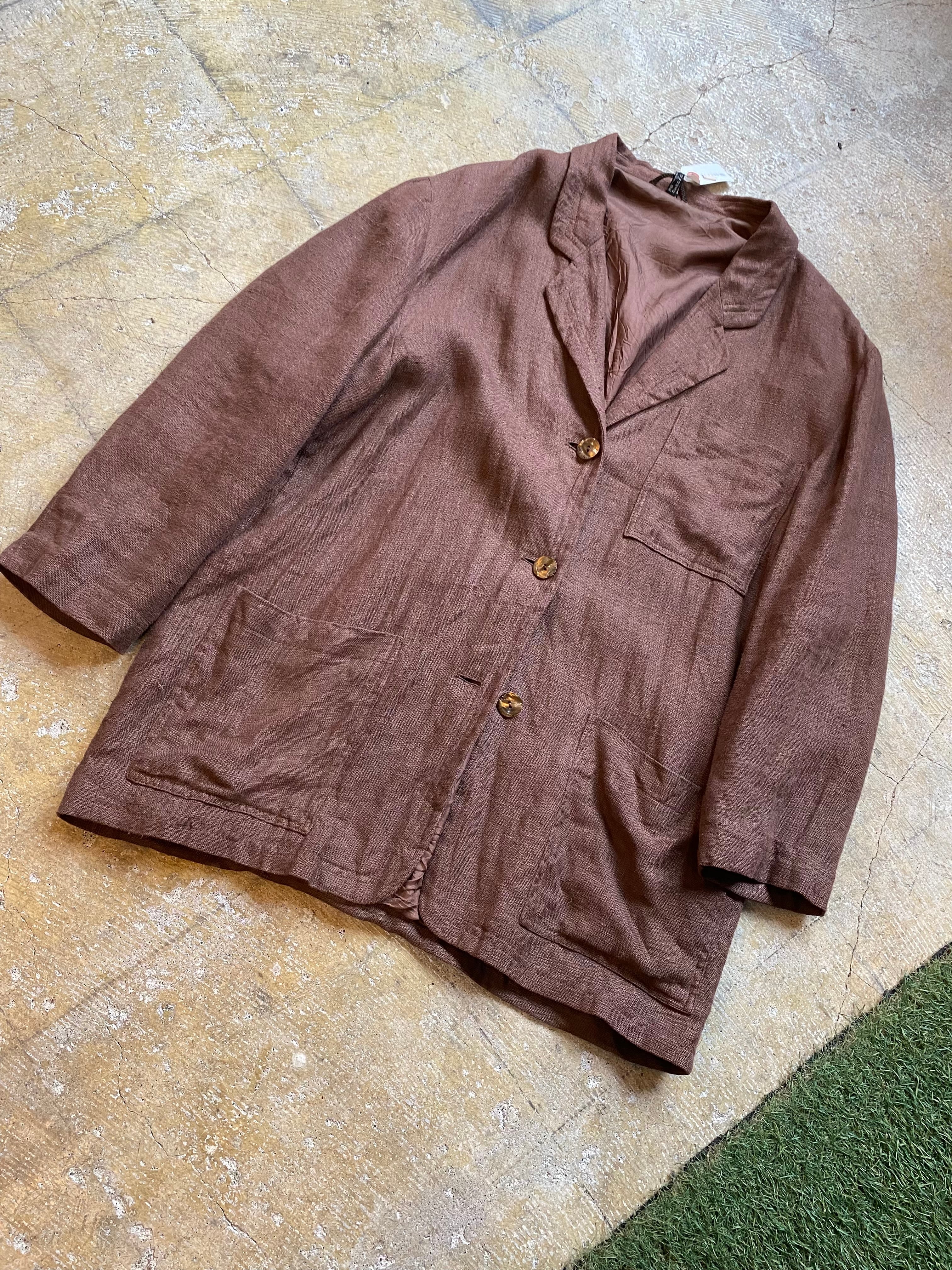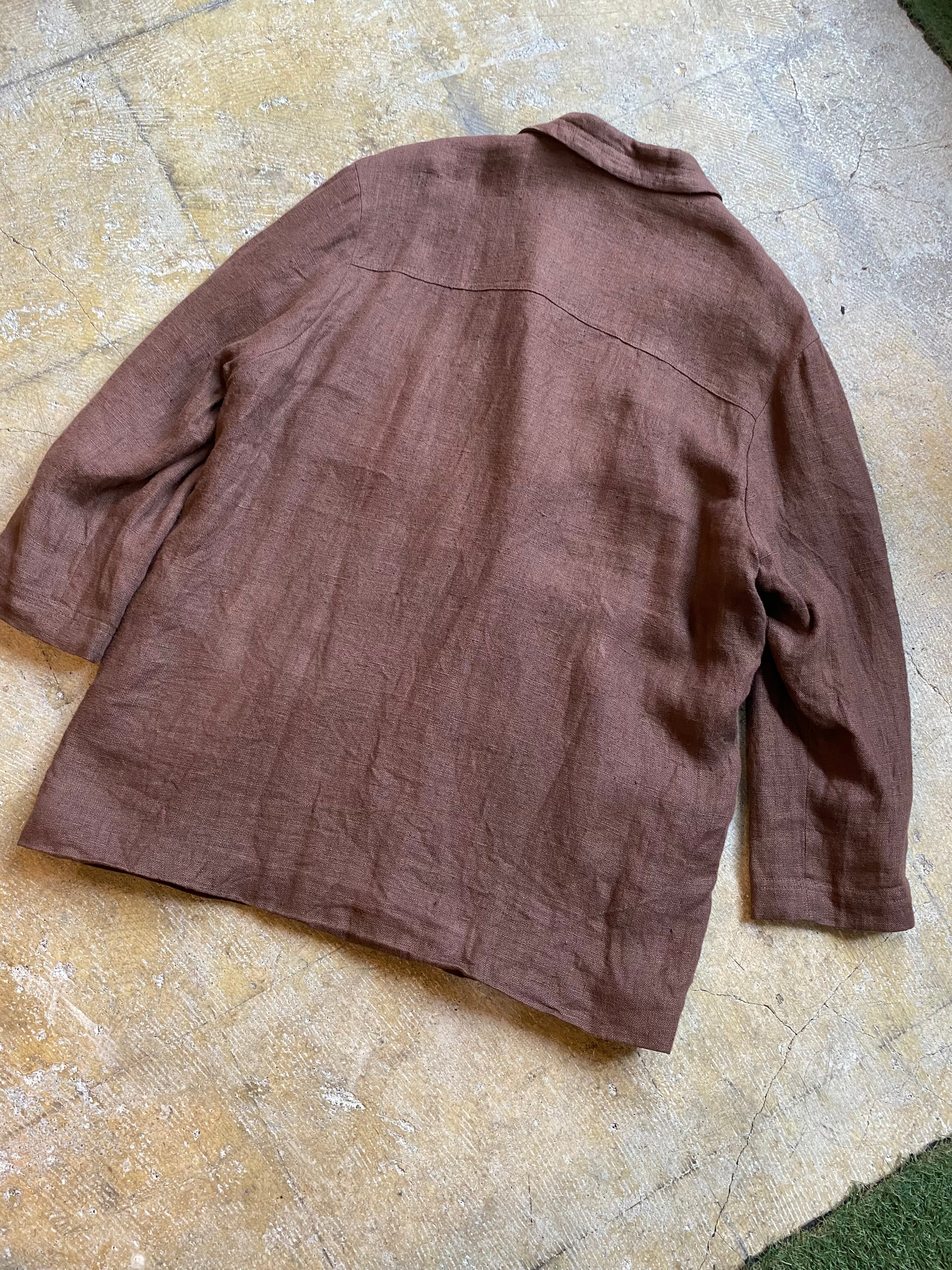 ヨーロッパのデザインリネンジャケットです。レディース合わせですが大きめなのでユニセックスでの提案です。ブラウンのカラーが素敵ですね。1枚目が実物に近いカラーです。ぜひ。