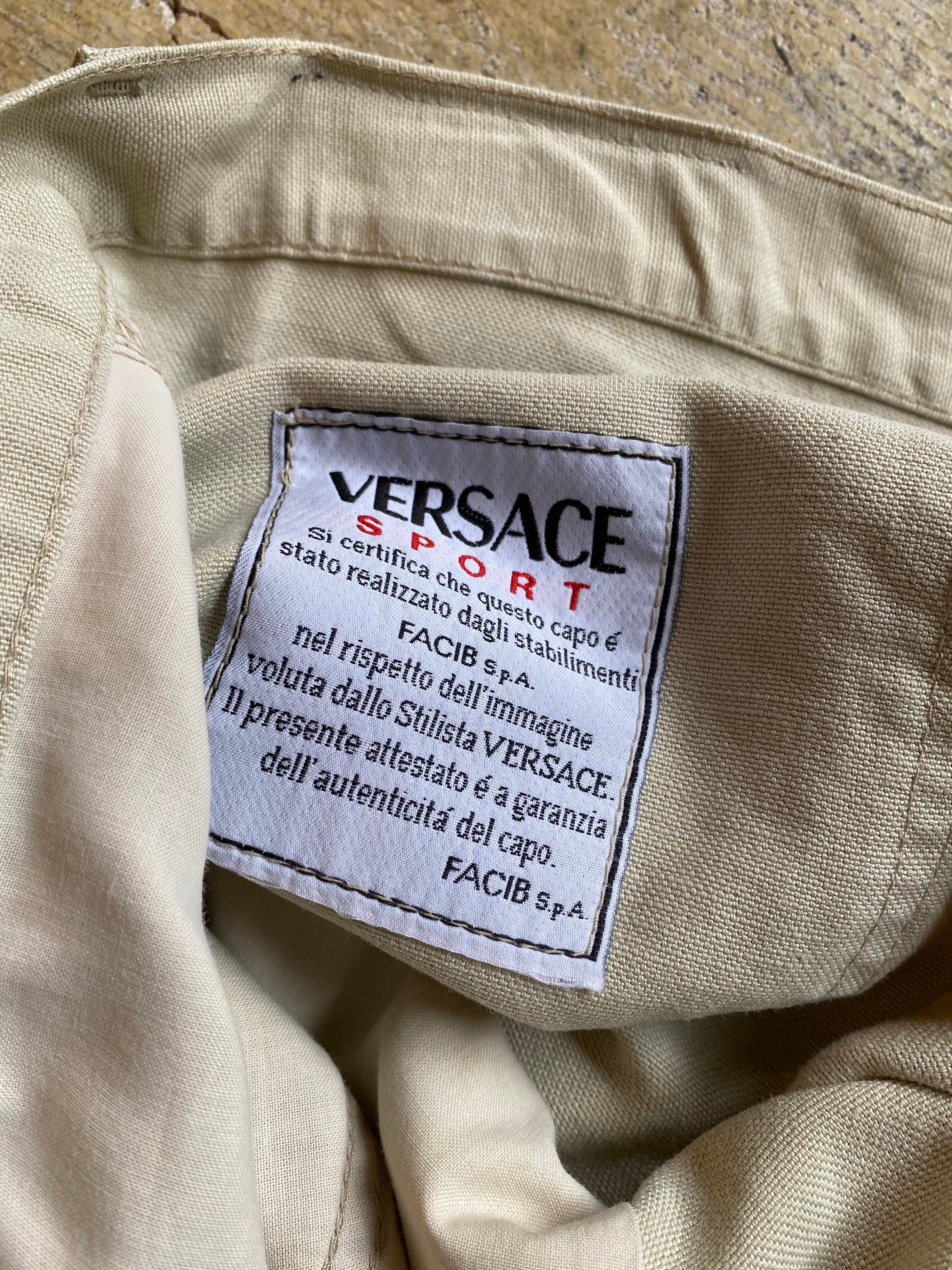 ヴェルサーチのデザインショートパンツです。品質タグが欠損していますがおそらくリネンが使われていると思います。2枚目の画像が実物に近いです。ぜひ。
