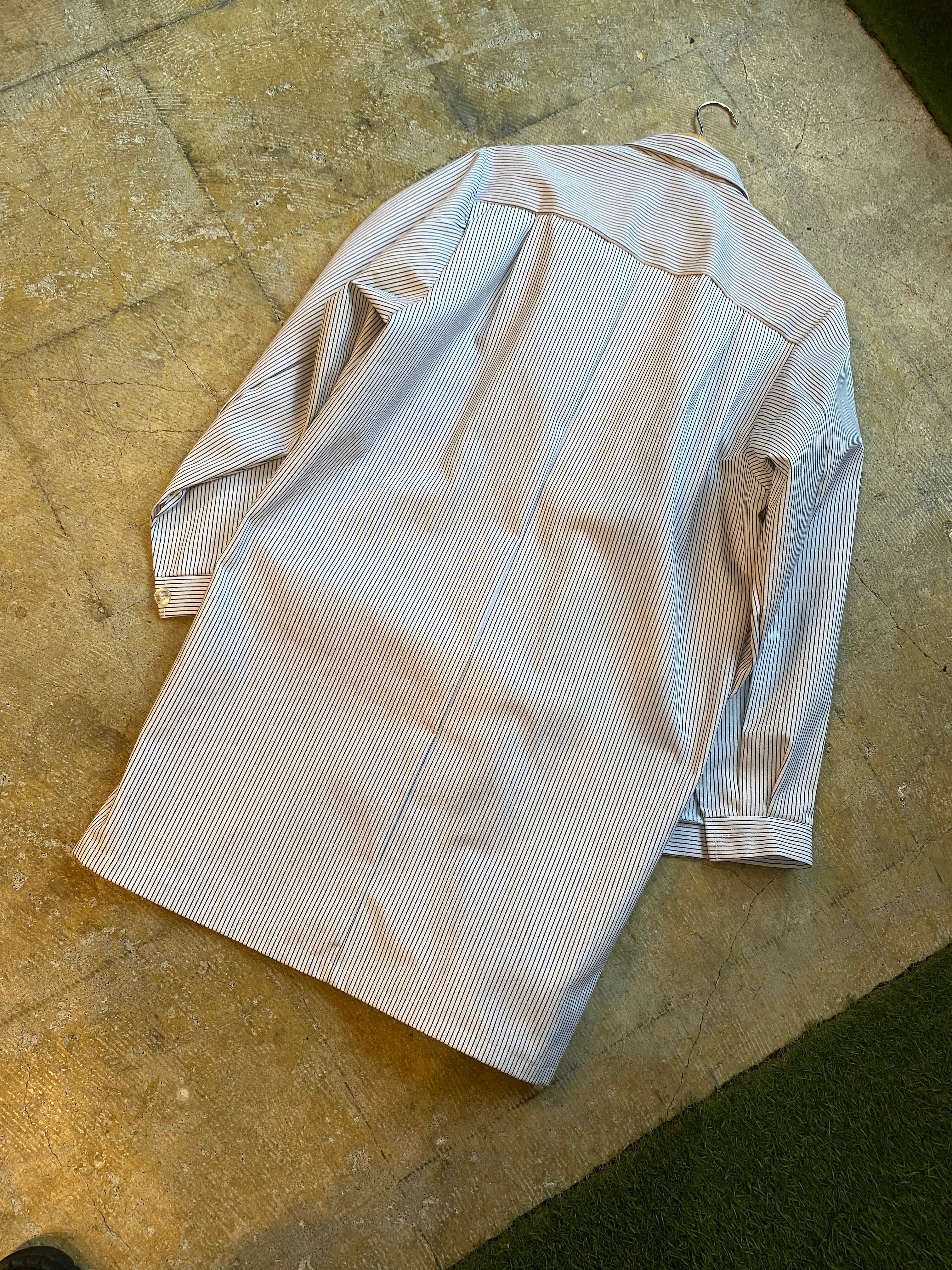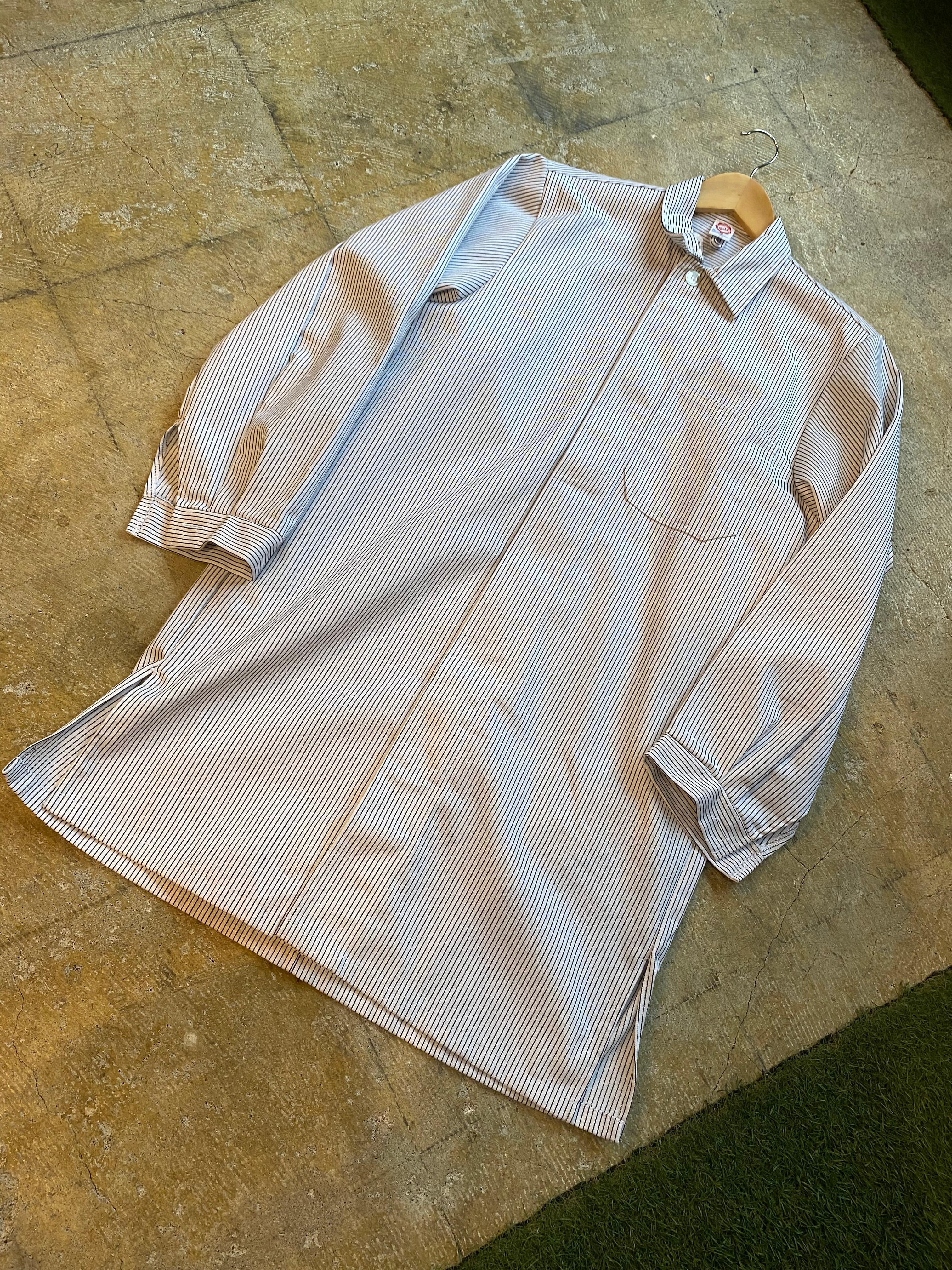 ドイツのポリエステル&コットンのワークコートです。ショップコートとロングシャツの間のようなデザインが素敵です。3枚目が実物のカラーに近いです。ぜひ。