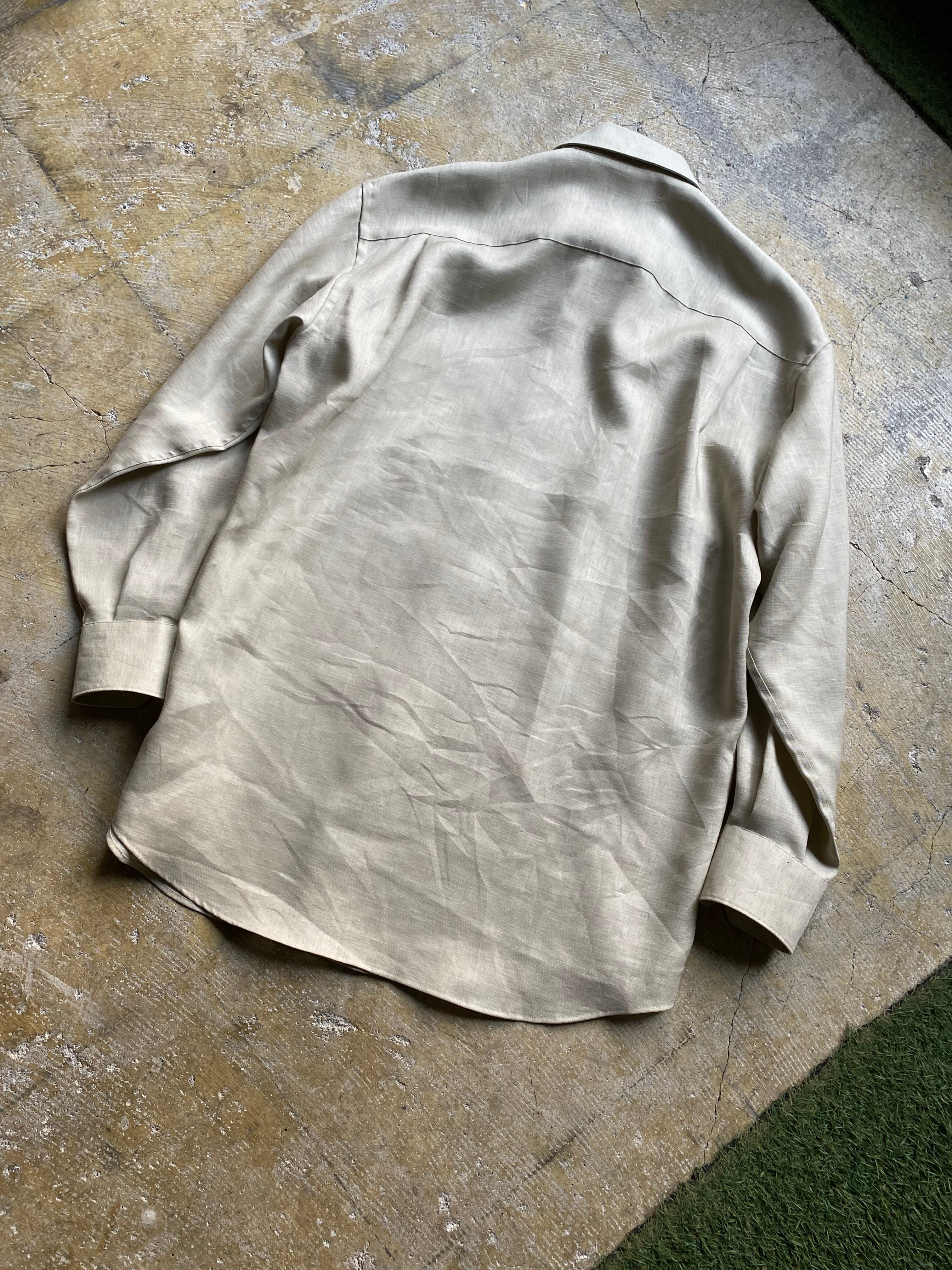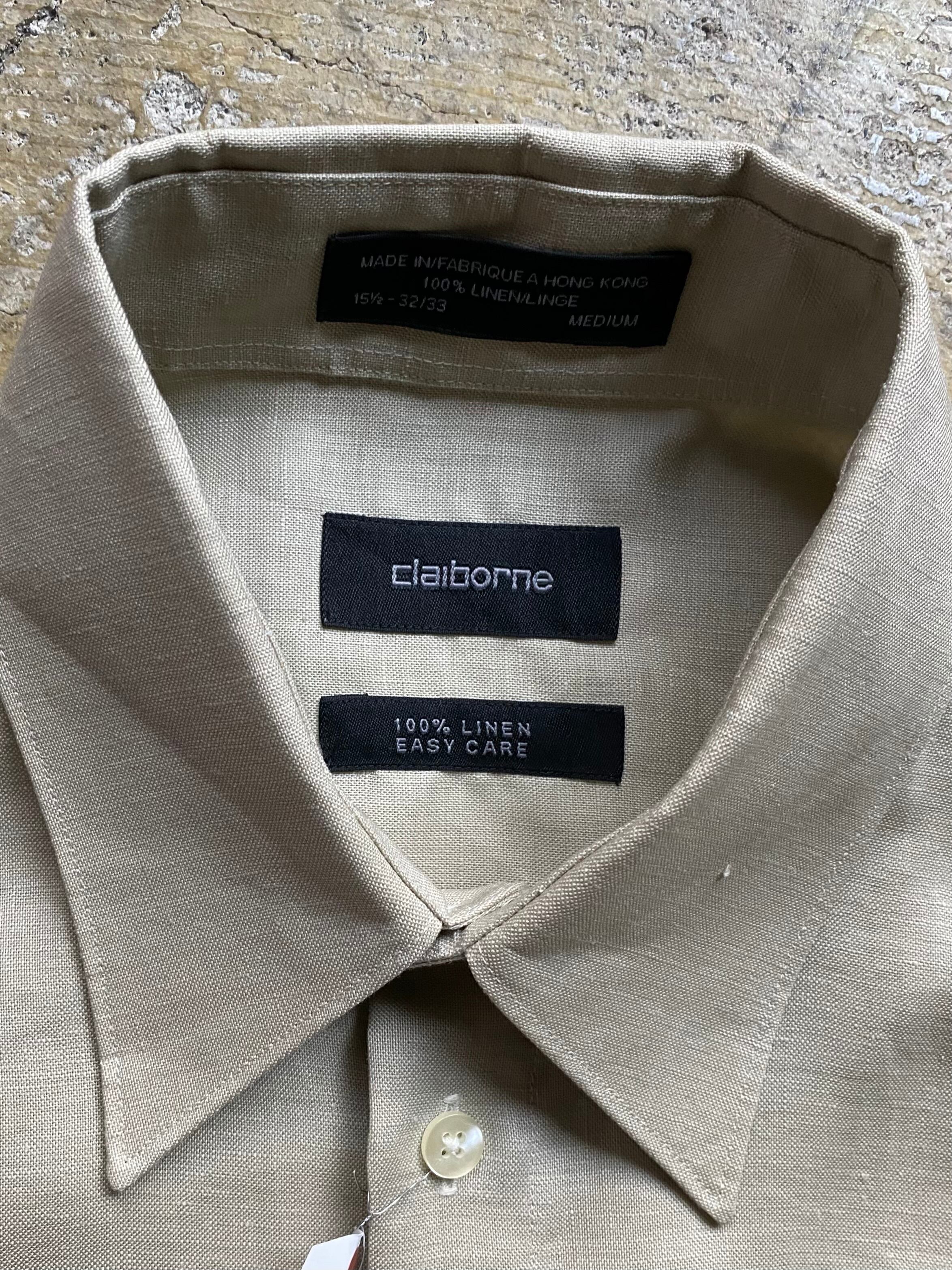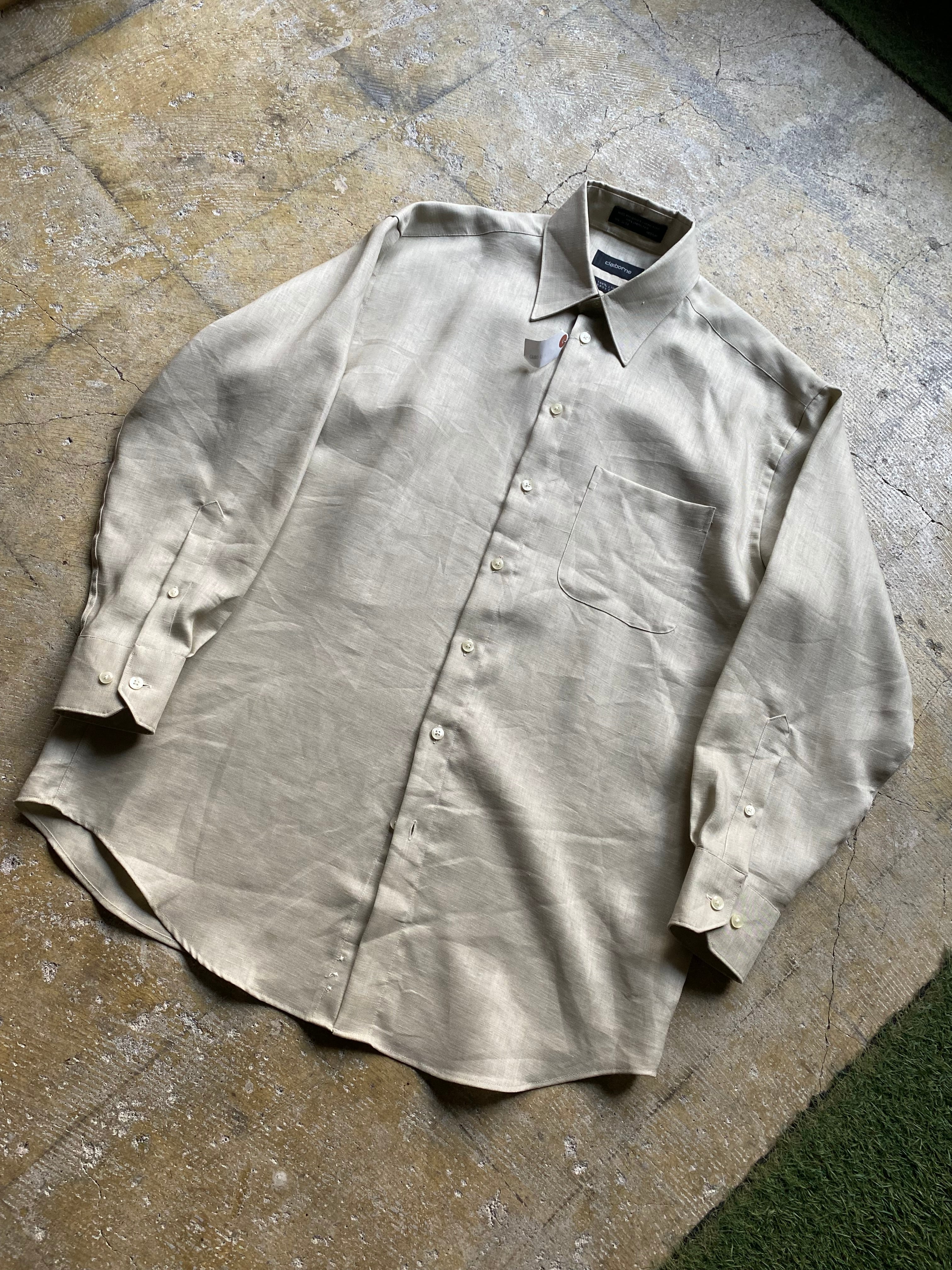 アメリカのClaiborne社のリネンシャツです。おそらくデットストックでまだ水通しがされてない生地です。パリパリしていてどこかのモードブランドのような佇まいです。3枚目が実物に近いカラーになります。ぜひ。